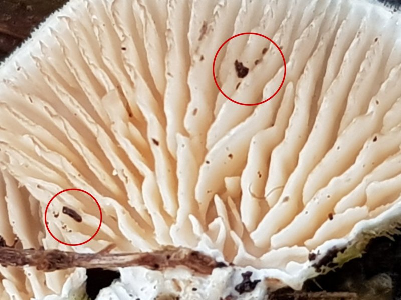 Il n'est pas rare que des Crepidotus montrent de telles gouttelettes sur l'arête des lames, je trouve l'explication des gerçures peu vraisemblable.