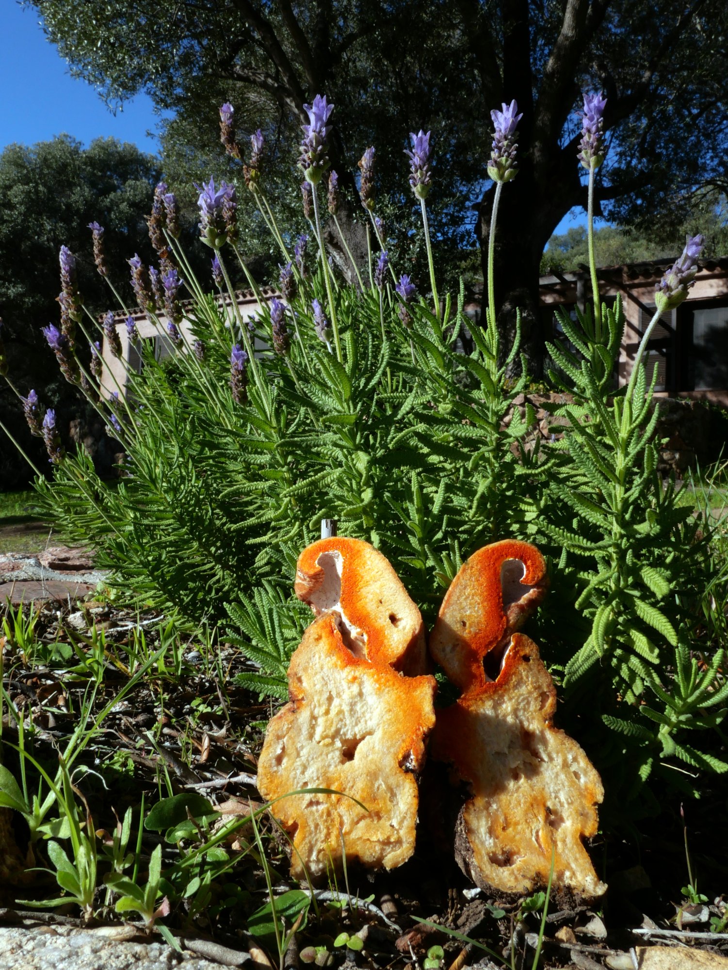 Non, ce polypore n'a pas poussé près de cette Lavandula dentata, le petit rebord où elle fleurit est juste pratique pour les photos ! En fait, le champignon poussait vers Borivoli (C.-du-S.), au milieu d'un chemin sombre, à terre, peut-être sur bois enfoui, en lisière d'un bois touffu de feuillus (chênes verts, arbousiers, bruyères arborescentes), peut-être quelques pins non loin, le 13/01/21 à la tombée de la nuit, photo in situ impossible.