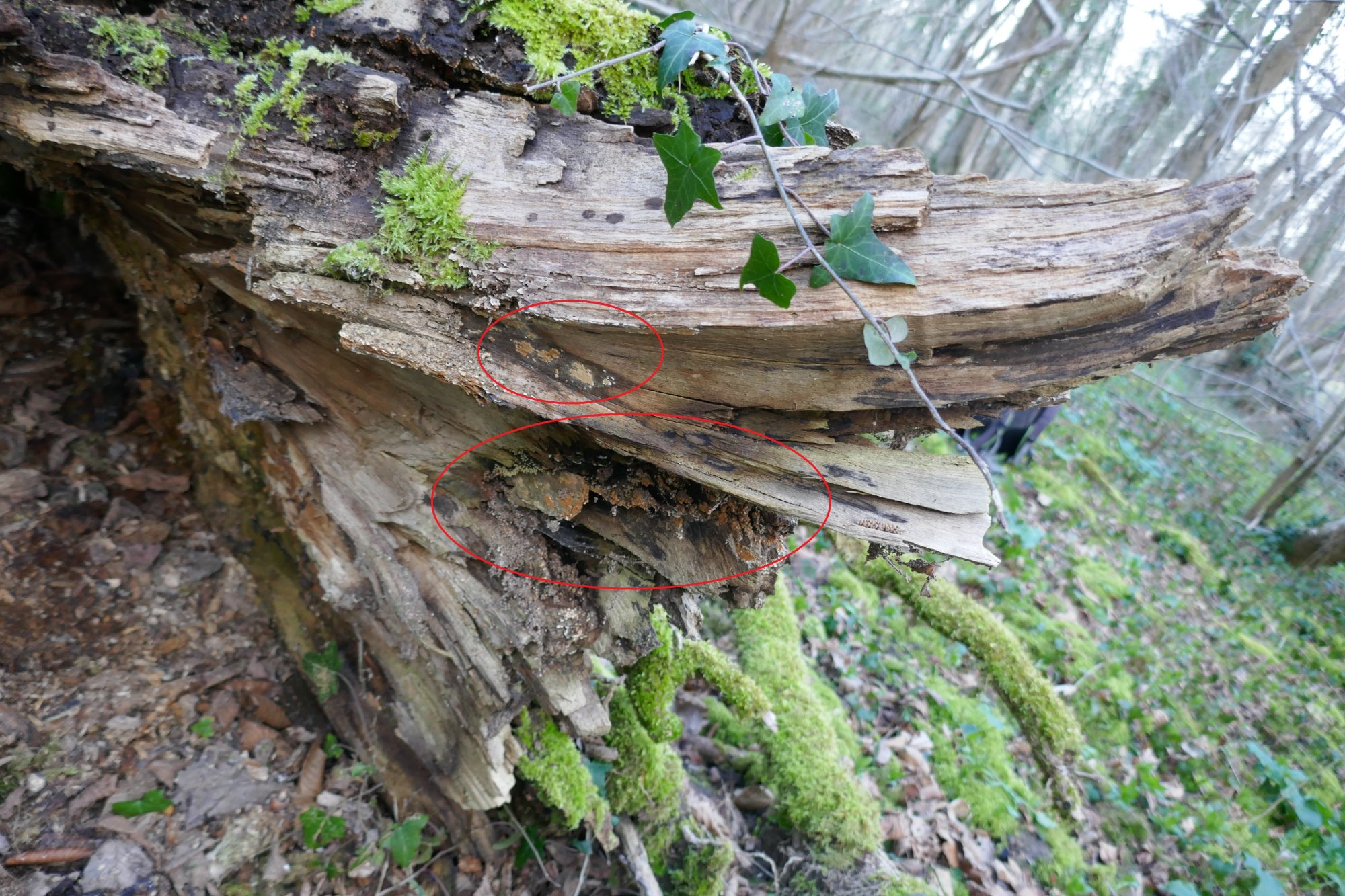 Macro: Croûte rouge/orangée qui se délite quand on l'attaque au scalpel, à la base d'un tronc couché de feuillu (oublié de noter l'espèce).