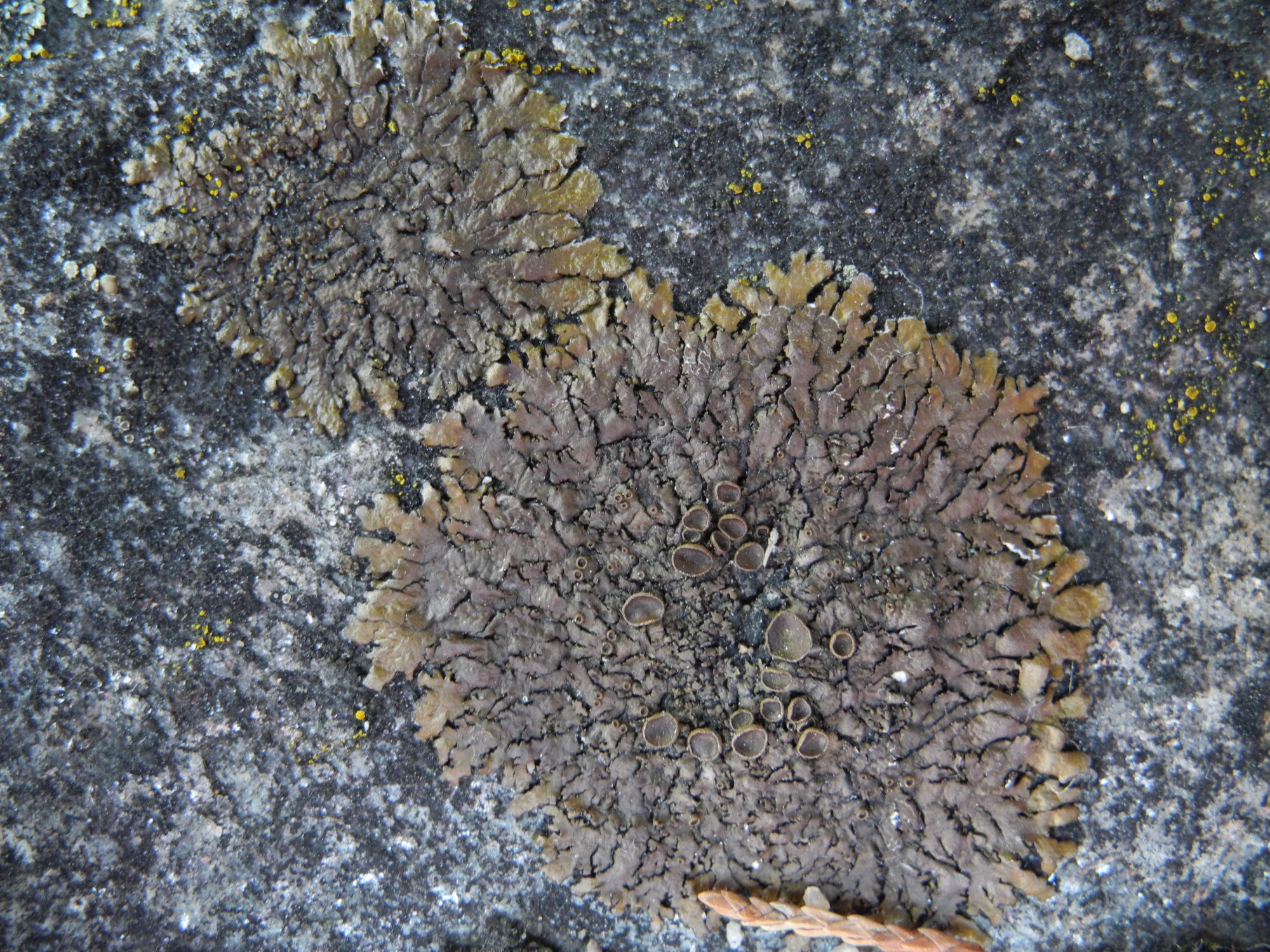 Application au spécimen de Carex qui est plutôt foncé, dont la surface est brillante, et dont les lobes ne portent pas de macules : ce serait bien Xanthoparmelia pulla.
