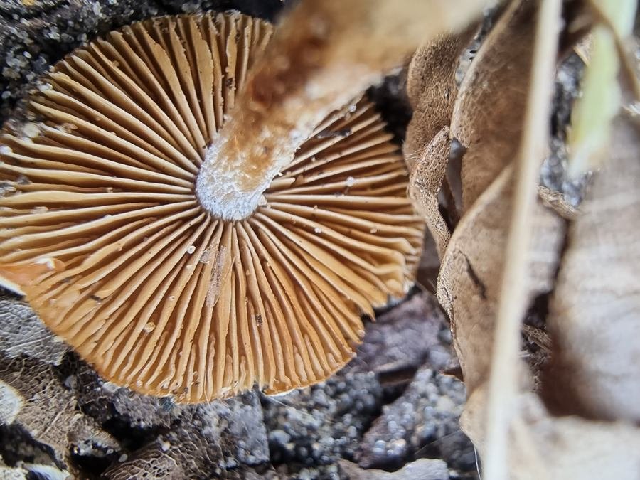 Chapeau : 1.5 cm de diamètre, convexe à aplani légèrement mamelonné, hygrophane, brun rouillé à ocre, plus sombre au milieu