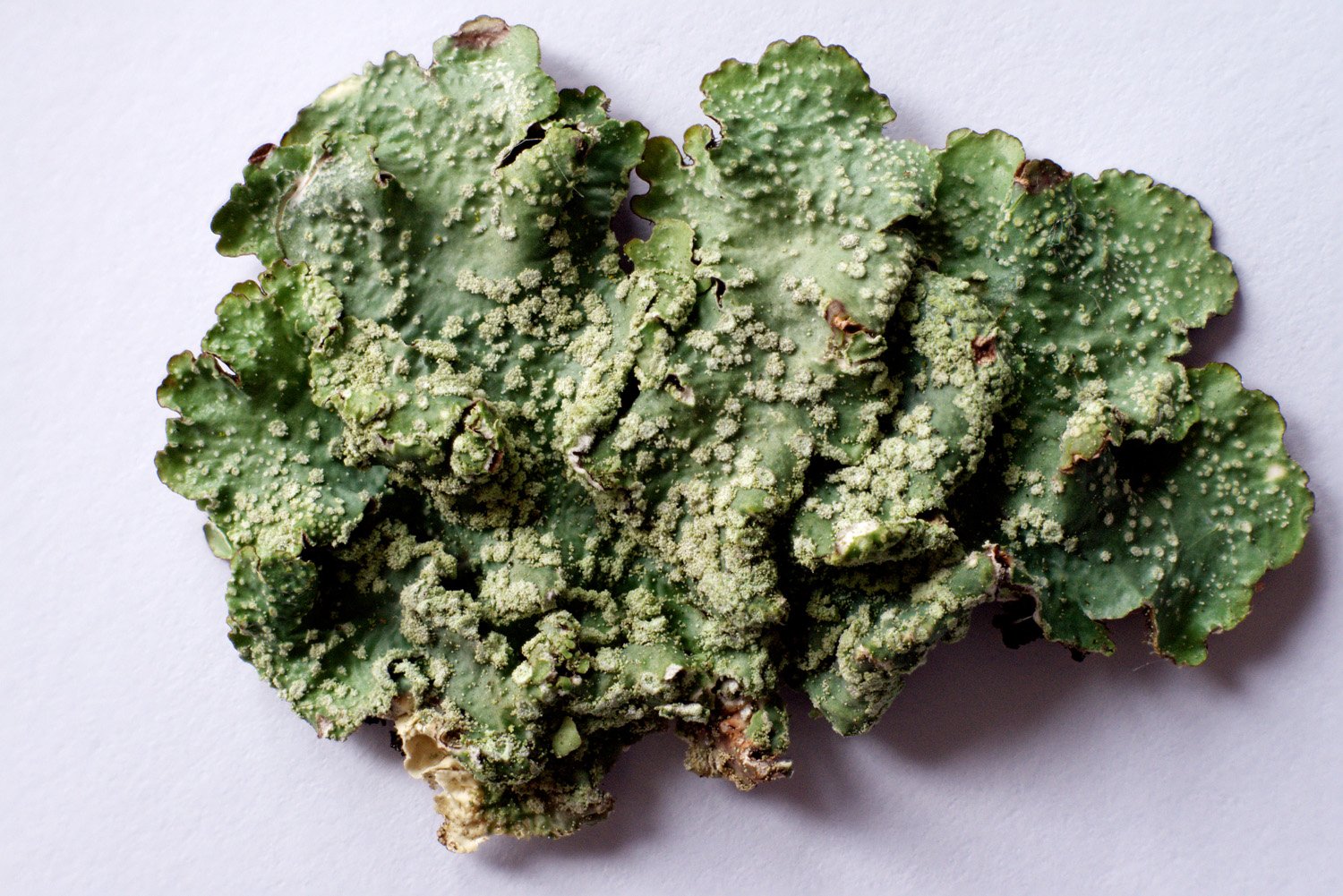Et bien sûr les soralies, mêmes laminales, peuvent naître sans pseudocyphelles, comme chez Flavoparmelia caperata.