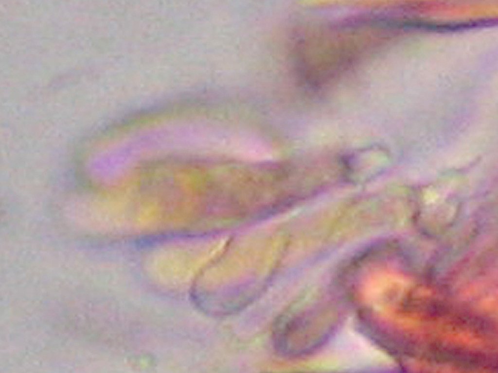 Fifi, je comprends ta réticence face à ma photo, prise à main levée avec une mise au point compliquée ici au microscope. La cystidiole au dessus est vraiment fusiforme en jouant avec la molette, et l'autre en dessous derrière est bien cylindrique clavée. Je n'ai pas plus à vous montrer. Je veux bien refaire une micro de la récolte d'origine présentée ici. Mais vous conviendrez que les micros des livres ne sont guère beaucoup plus explicites ?
