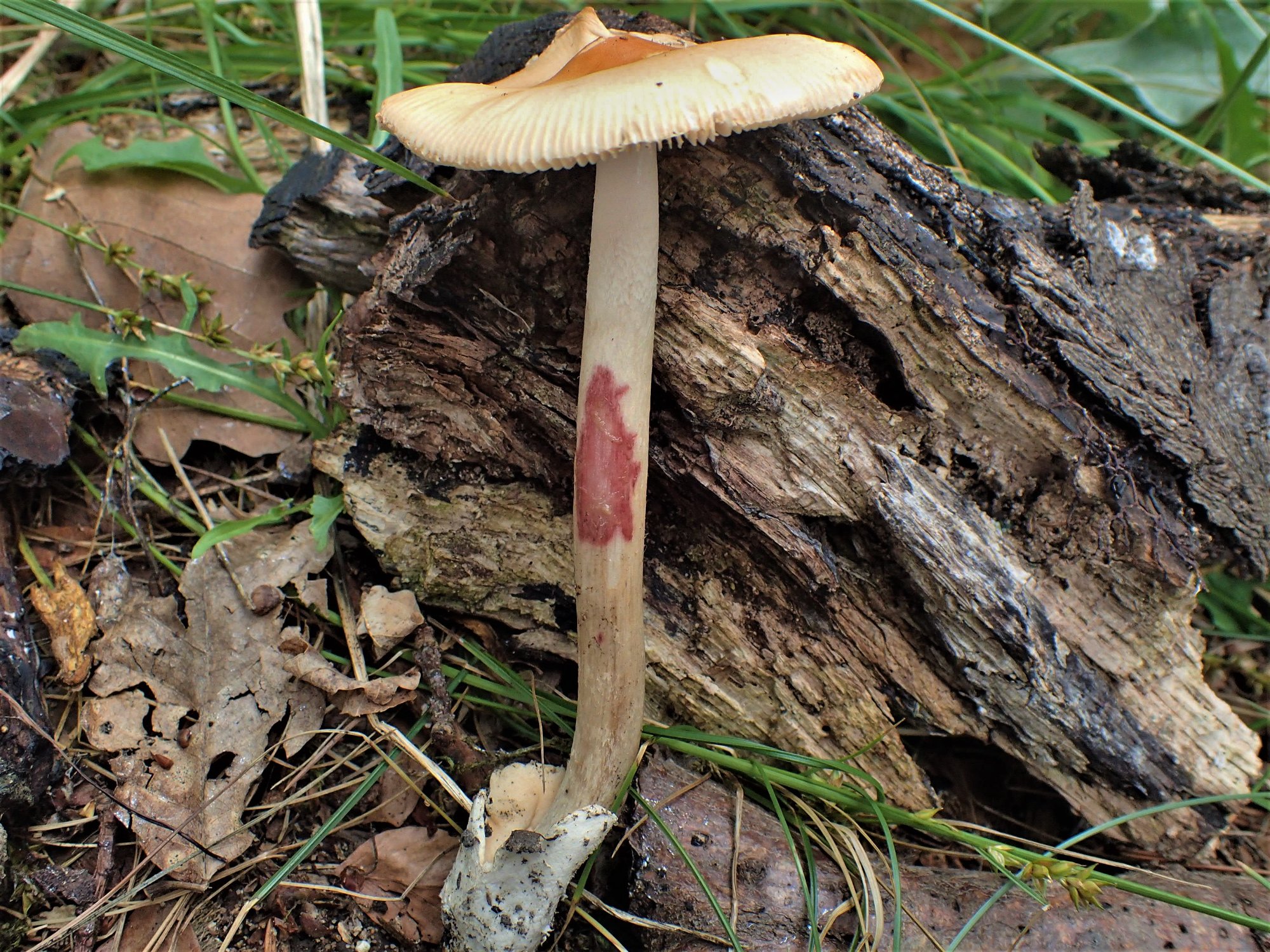 En vue de la couleur assez foncée du chapeau, on peut aisément éliminer A. flavescens. Le stipe non chiné exclut A. crocea. On peut donc en conclure sans microscopie qu'il s'agit soit d'Amanita subnudipes, soit A. romagnesiana que je ne connais que trop peu.