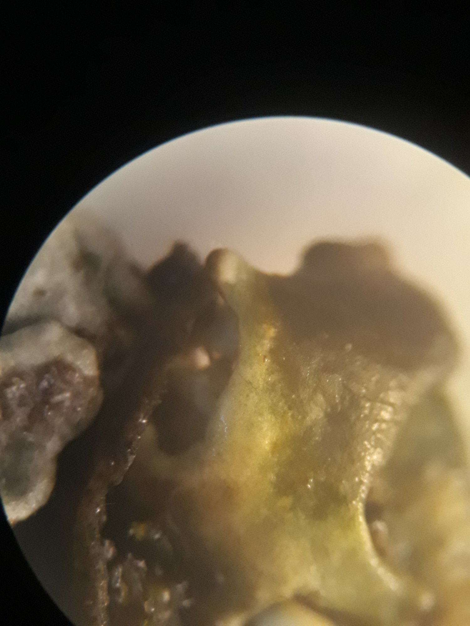 J'ai placé l'individu à la bino x40 comme recommandé dans le Belin pour observer la présence ou l'absence de macule noir (voir l'espèce dans Lichens marins qui en parle davantage que l'AFL).