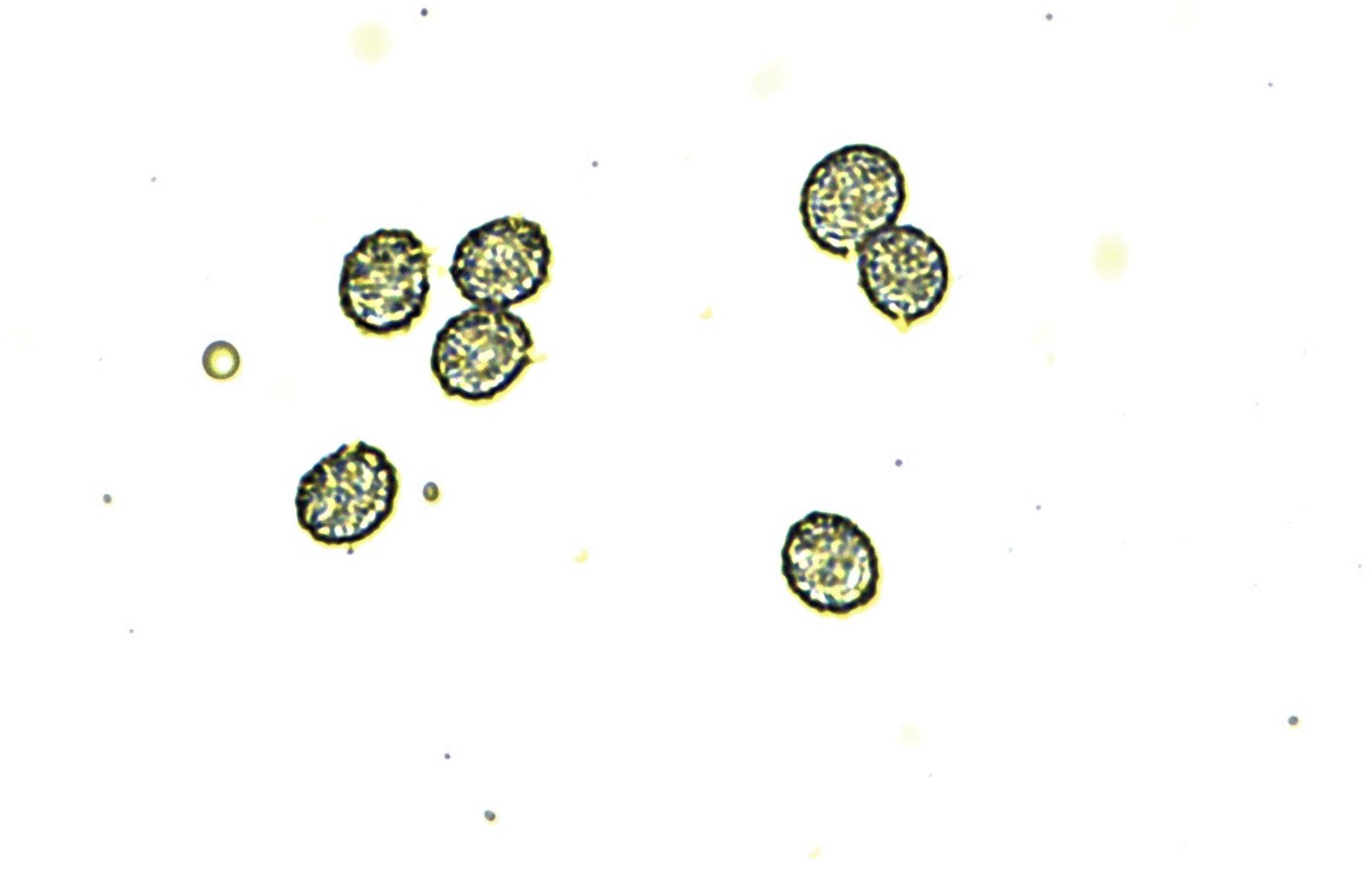 Spores 6,2-6-8 X 5,2-6,6 µ verrues basses partiellement reliées.