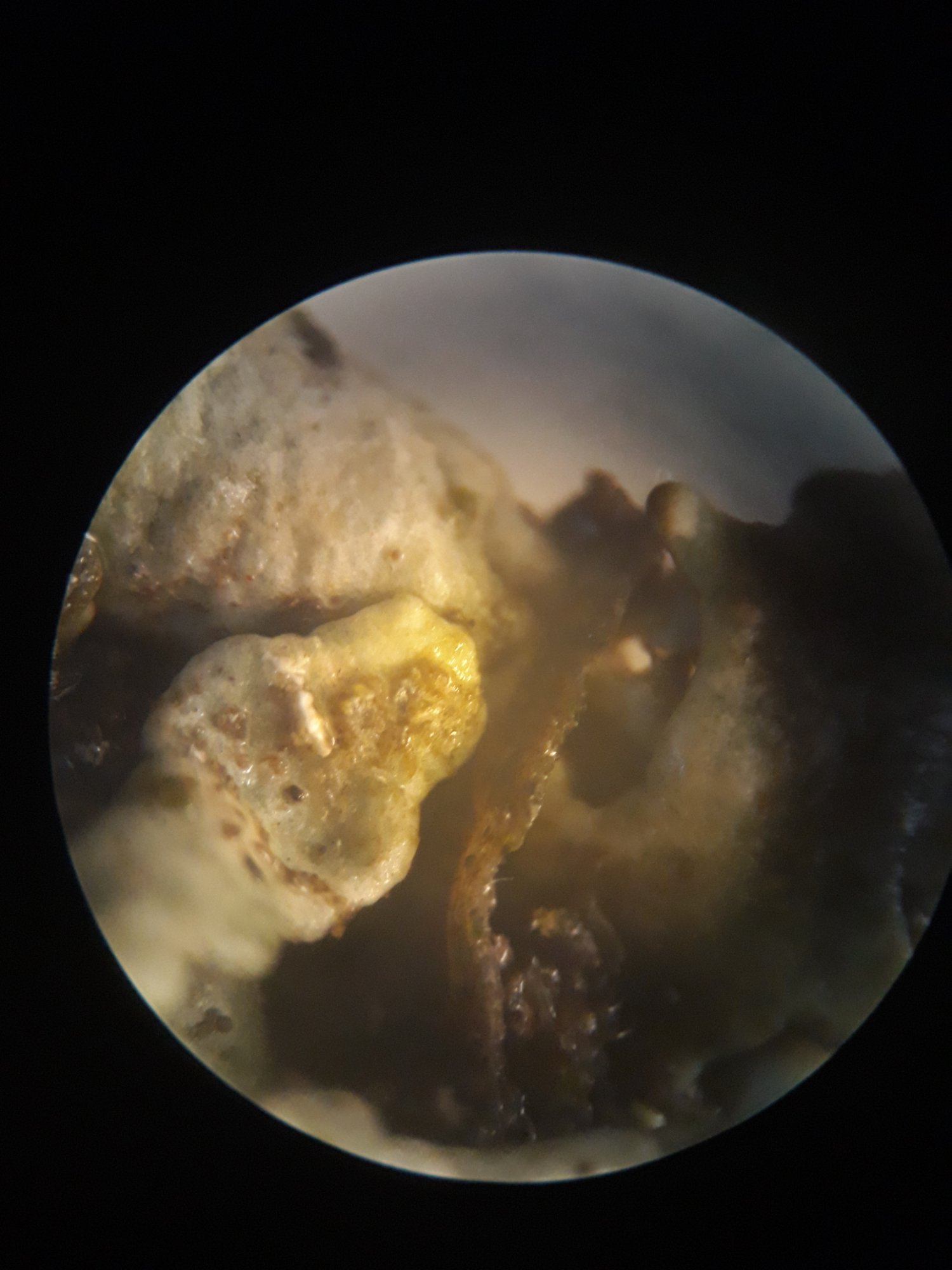 J'ai placé l'individu à la bino x40 comme recommandé dans le Belin pour observer la présence ou l'absence de macule noir (voir l'espèce dans Lichens marins qui en parle davantage que l'AFL).