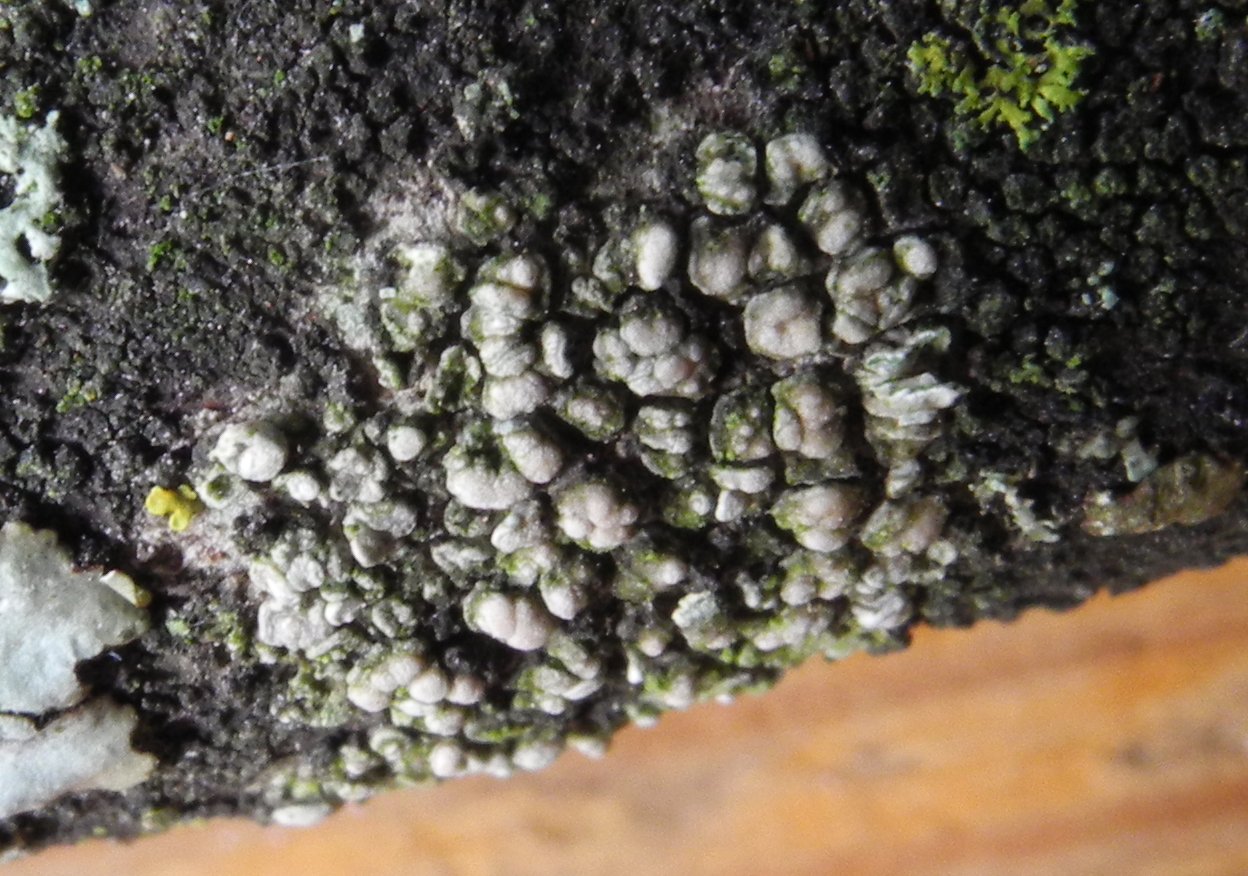 Voici la macro qui permettra, j'espère, de décider si ces formations rondes, contenant des bidules blanchâtres et boursouflés, sont des squamules (alors ce lichen serait un Normandina squatté par un champignon) ou des apothécies en mauvais état (alors ce serait un Lecanora mal foutu)