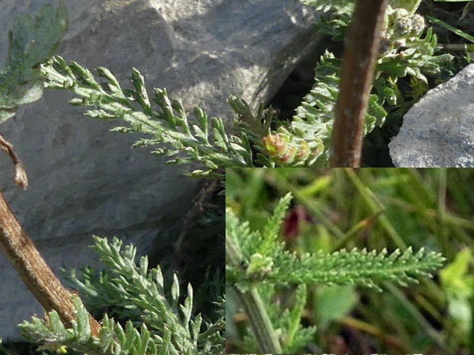 Les feuilles de Achillea distans sont plus larges, avec un rachis ailé ( ? Je ne vois toujours pas trop ce que cela signifie concrètement ) et sont munies de lobules aigus : il me semble que l'on voit ce dernier point sur la photo des feuilles comparées.