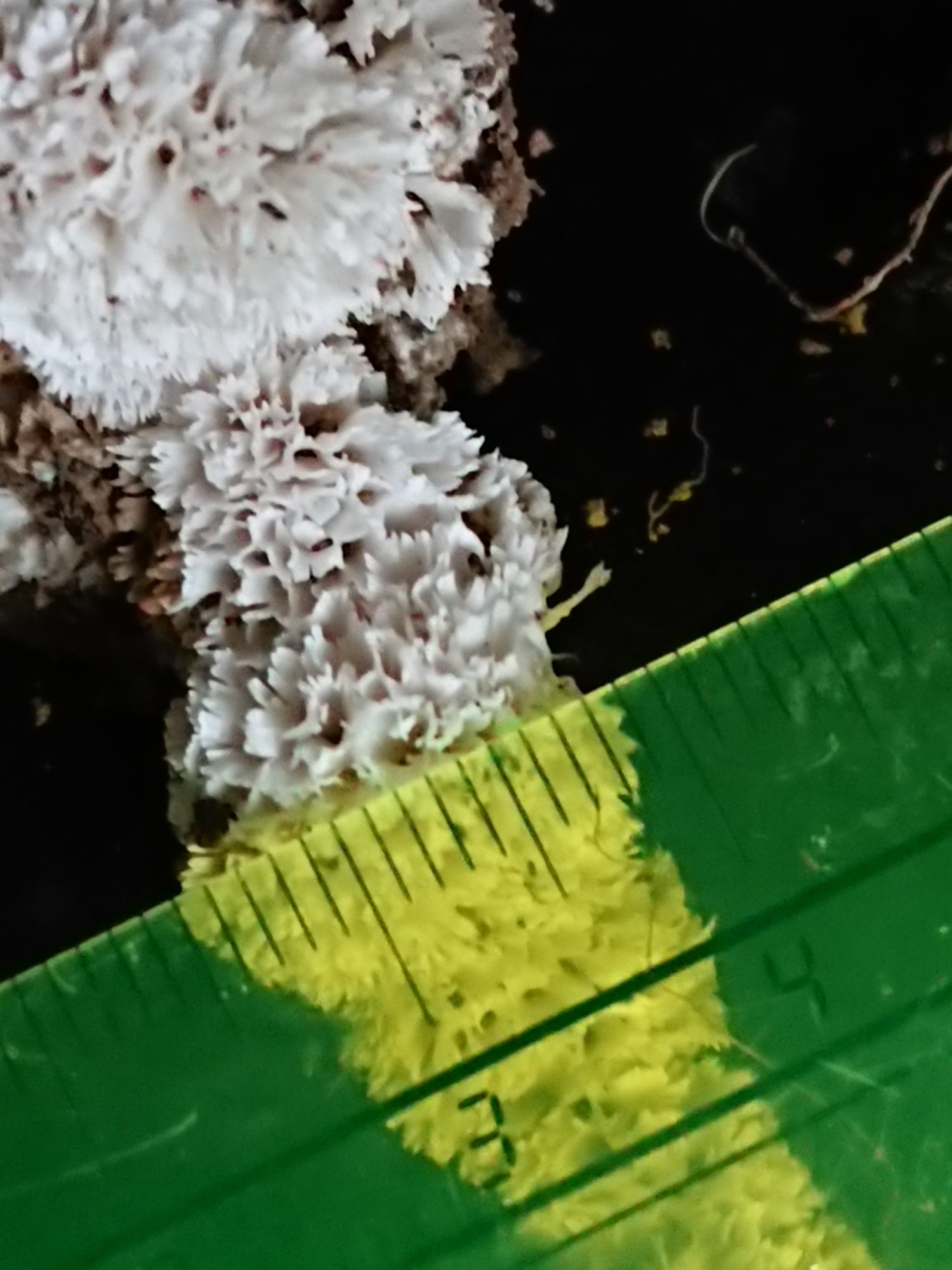 Mais bon, en l'occurrence n'aie pas de regrets : on a tous remarqué que ça ressemble à un Sparassis mais ce n'est sans doute pas ça. Nos recherches nous amènent vers la section du FTE "polypores annuels cotonneux, résupinés, à carie blanche". Sous toutes réserves.