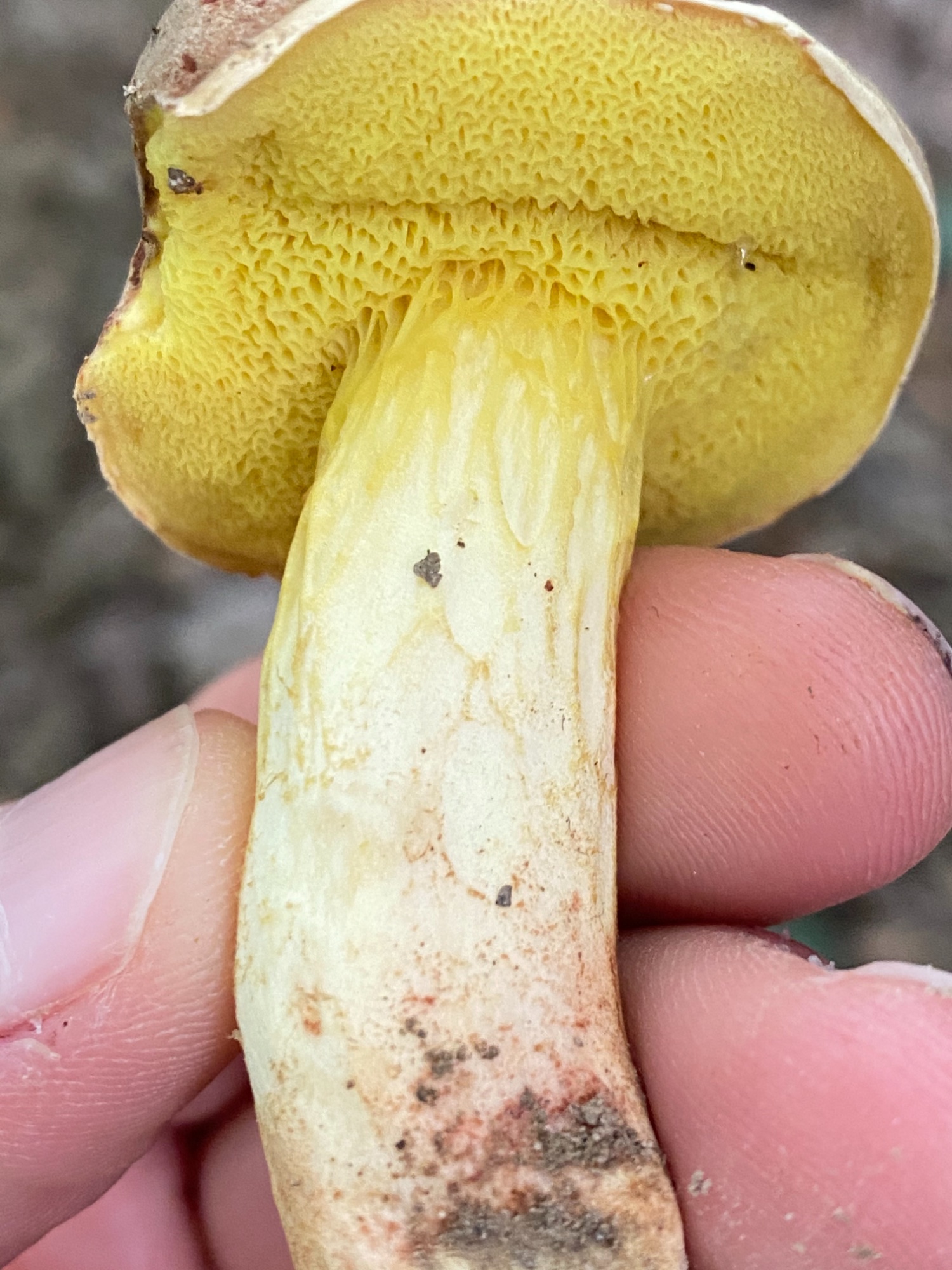10 oct. 2021, 20:05Falcord a écrit : Merci pour votre aide,On n'y pense pas toujours mais c'est souvent en regardant les pores qu'on peut éviter de partir dans la mauvaise direction. Ici, ils sont assez larges et anguleux, ce qui n'est le cas ni chez les Boletus ni chez les Leccinum. C'est en revanche toujours le cas chez les Xerocomus. Associé à une couleur jaune vif, un chapeau feutré non craquelé, des côtes en relief sur le pied et une chair rosâtre à la base, tous les ingrédients sont réunis pour X. subtomentosus, en effet.