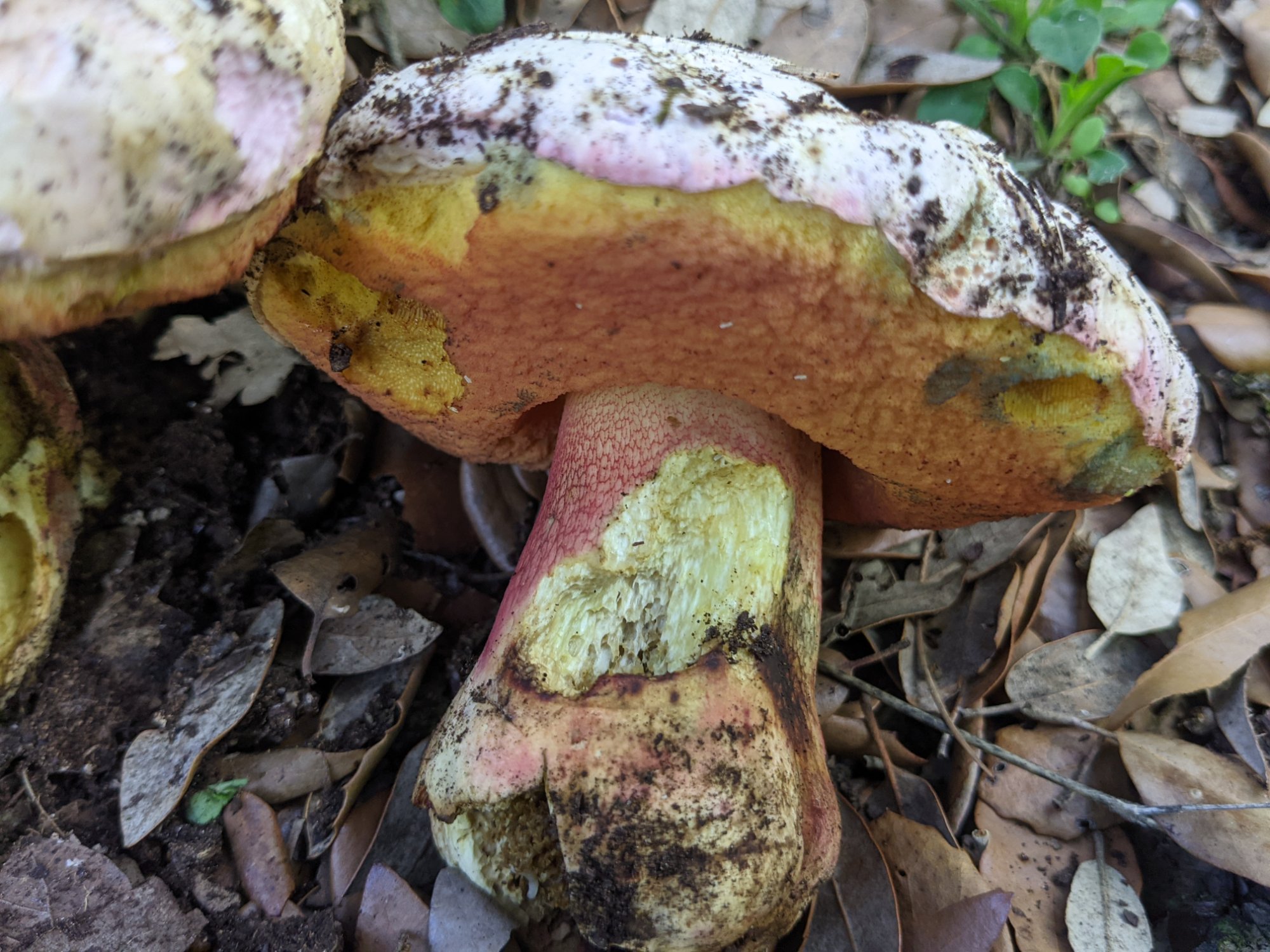 Si on est dans les spécimens un peu atypiques, qu'est-ce qui fait exclure ma proposition de calopus ? Au moins on a le chapeau blanchâtre + les pores jaunes bleuissants, + le pied réticulé rouge en bas et jaune en haut, seule la chair est un peu rosée là où on l'attendrait un peu bleutée, et d'ailleurs c'est un rose violacé.