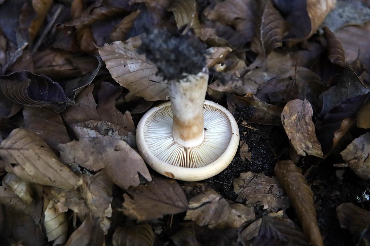 lames serrées, concolores, exsudant un lait blanc (pas observé de jaunissement sur lame ou mouchoir, après quelques minutes, car pas testé),