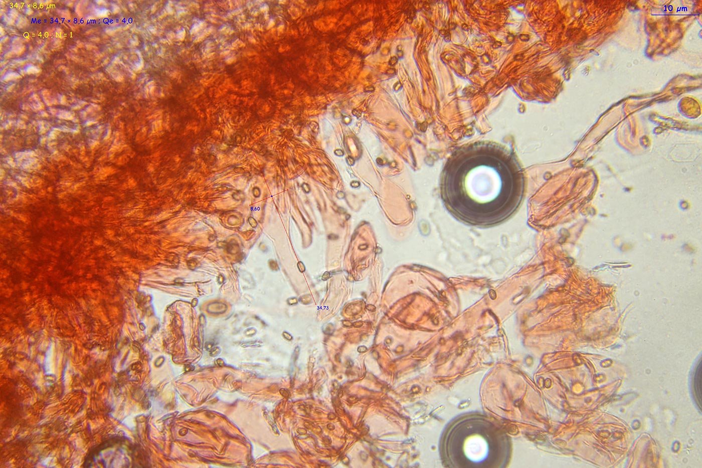 J'ai donc cherché des pleurocystides utriformes dans les quelques micros que j'avais réalisées (au pif) et j'ai trouvé ceci :