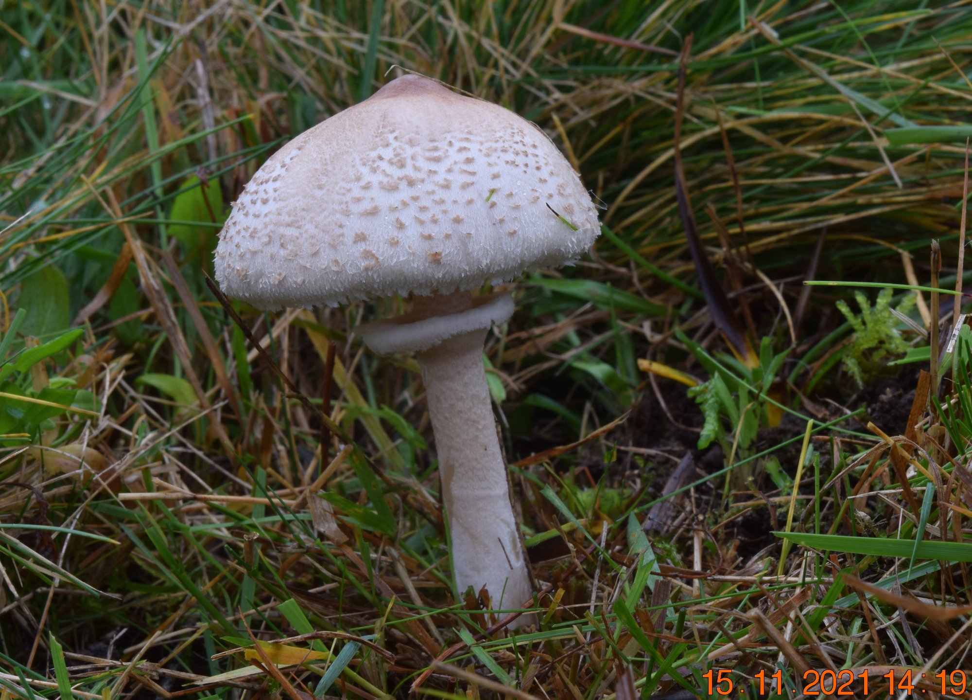 Une lépiote moyenne, la plus grande fait 10 cm de chapeau avec un pied de 12 x 1.5 cm - mamelon sombre proéminent et écailles fines se désagrégeant à partir de la marge - Lames libres montrant un pseudo-collarium - Anneau non double mais coulissant (Photo). Pied vaguement chiné. Odeur faible mais pas désagréable, chair douce. Je ne vois rien d'autre qu'une M. mastoidea des plus typiques.