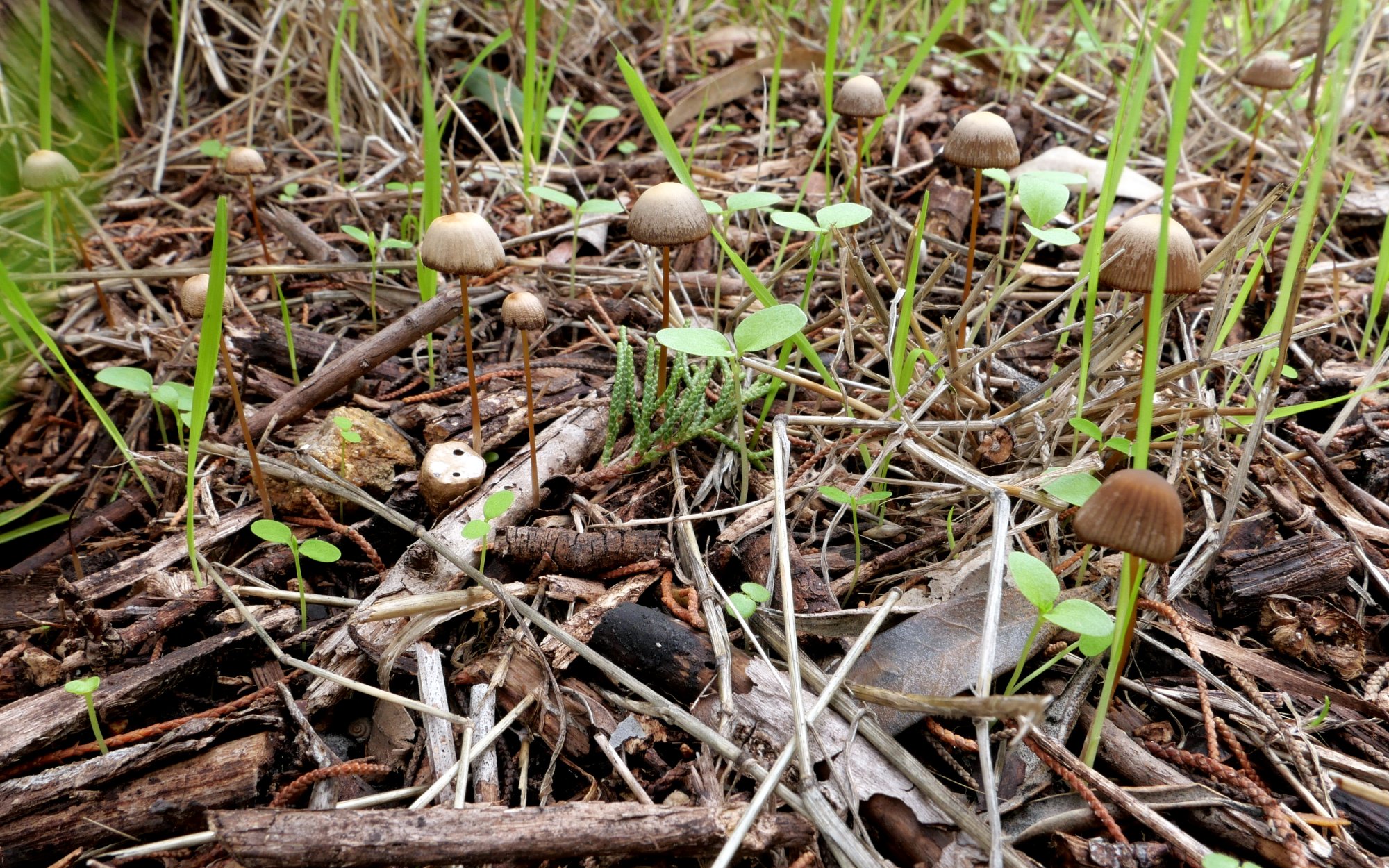 PS : pour info, je viens de corriger la taille des chapeaux dans ma description ; autant qu'il m'en souvienne 25 mm est exagéré, du moins pour les exemplaires qu'on voit, ils se situaient plutôt vers 15-20 mm, guère au-delà. Je n'en ai vu aucun étalé, auquel cas ils auraient évidemment pu atteindre 25-30 mm, mais, comme on le sait, certaines espèces ne déploient jamais leur chapeau.