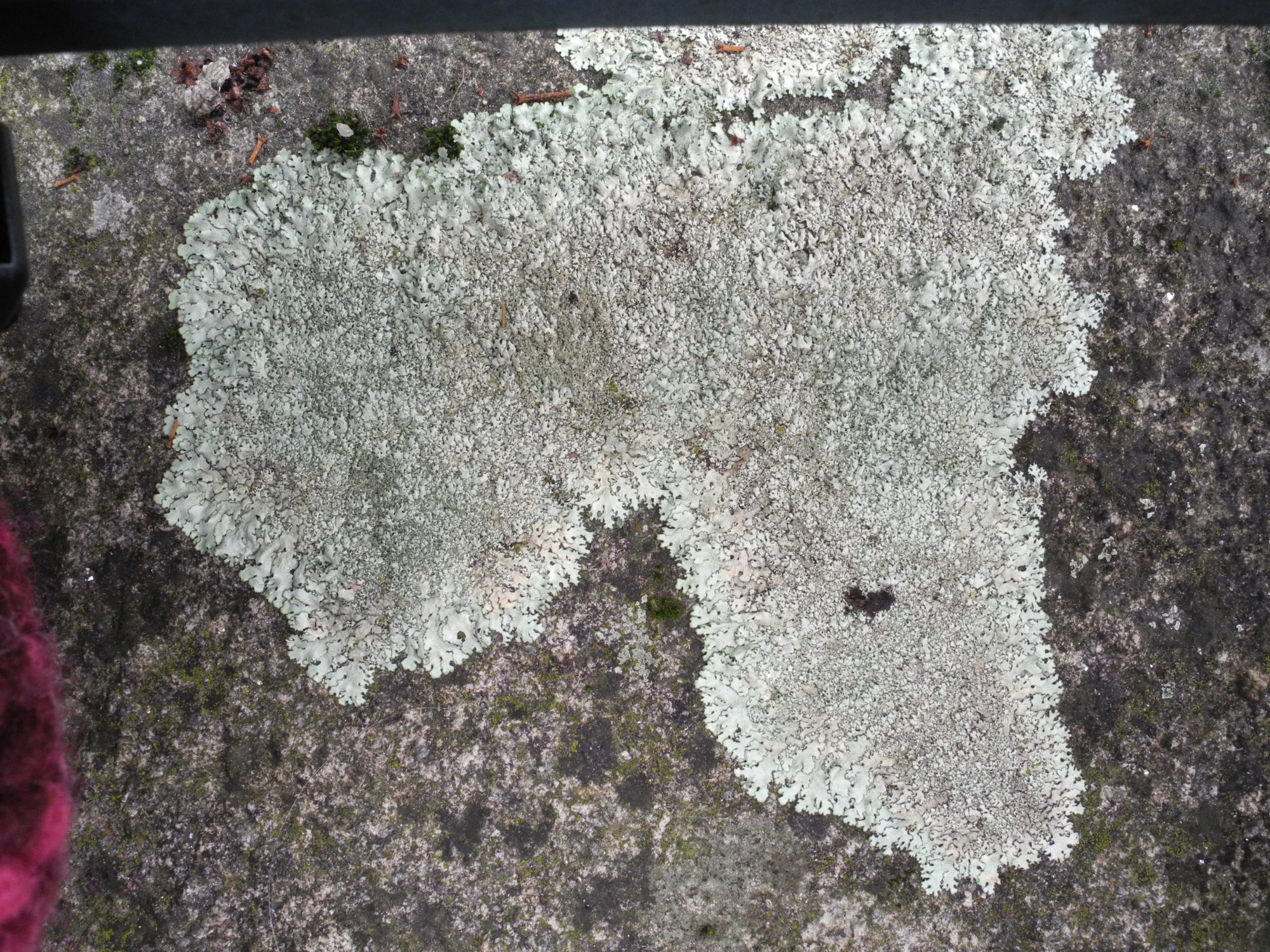Ces thalles, même les plus grands, ne portent aucune apothécie mais il n'y a pas d'isidies non plus : ce ne serait donc pas un Xanthoparmelia conspersa ayant fait voeux de chasteté.