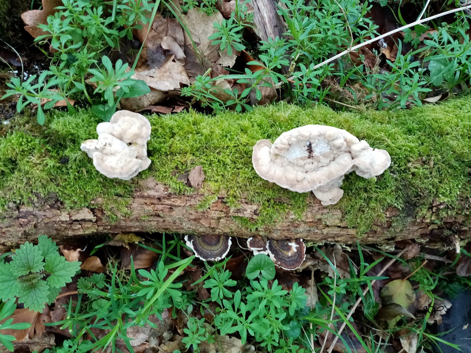 28 févr. 2022, 08:25Nommo a écrit : Bonjour Ghislaine,Non sur la première photo il y a juste en dessous des tramètes blanches, en suivant l'arrondi du tronc contre la terre 3 champignons