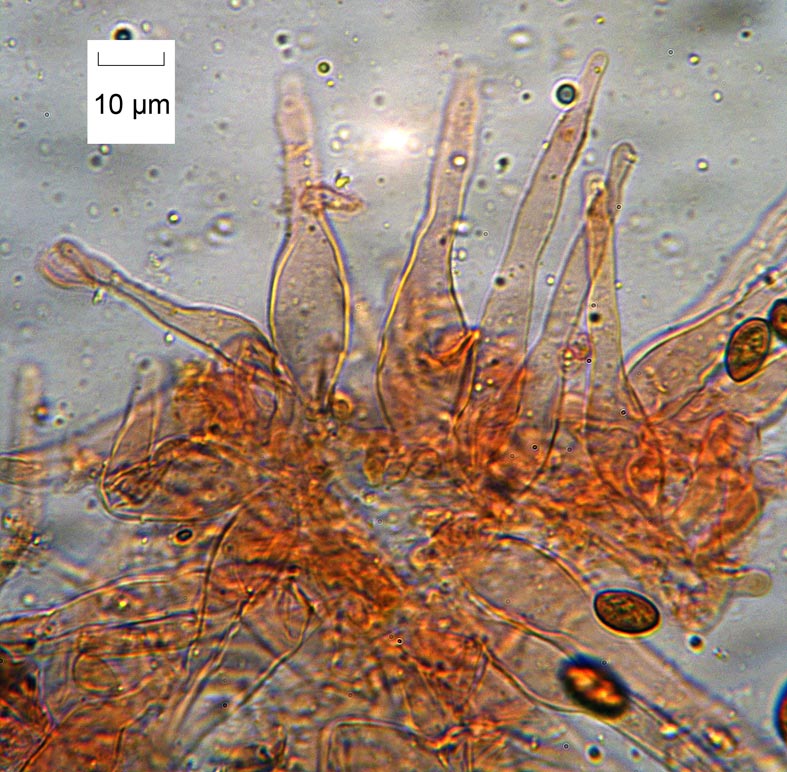Est-ce une cheïlocystide égarée sur une face de la lame comme cela peut arriver? D'un autre côté, cette cystide,d'après la barre d'échelle, semble atteindre 80µ, comme celles du groupe autumnalis/marginata alors que selon Moser,Watling et Bon, les cheïlos. d' uncialis ne dépassent pas 60-65µ. . Mais,par contre, Watling affirme qu'on reconnaît uncialis à son habitat (dunes,bois et serres), à ses spores très fortement rugueuses avec une périspore non lâchement décollée et à ses cheïlos. sveltes,minces dont les dessins correspondent à la photo micro des cheïlos. de tes exemplaires......Perplexité! Perplexité!