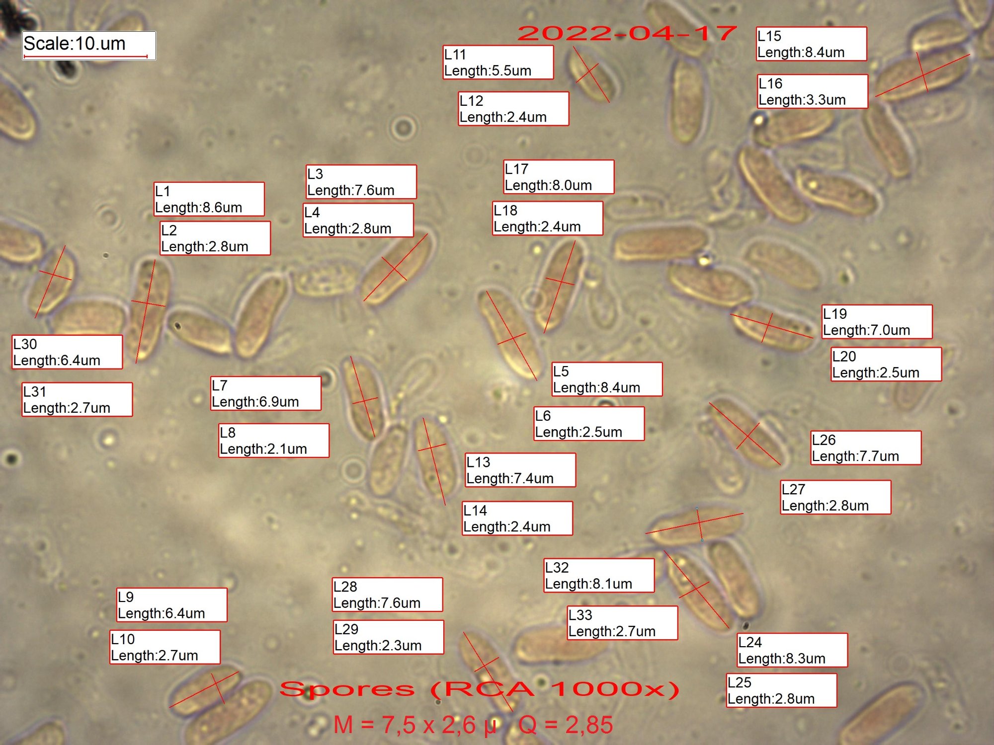 J'étais persuadé d'être en présence de Datronia mollis mais la mesure des spores est un peu en dessous de la moyenne de l'espèce, bien que la forme et le ratio L. x l. soit tout à fait conforme.