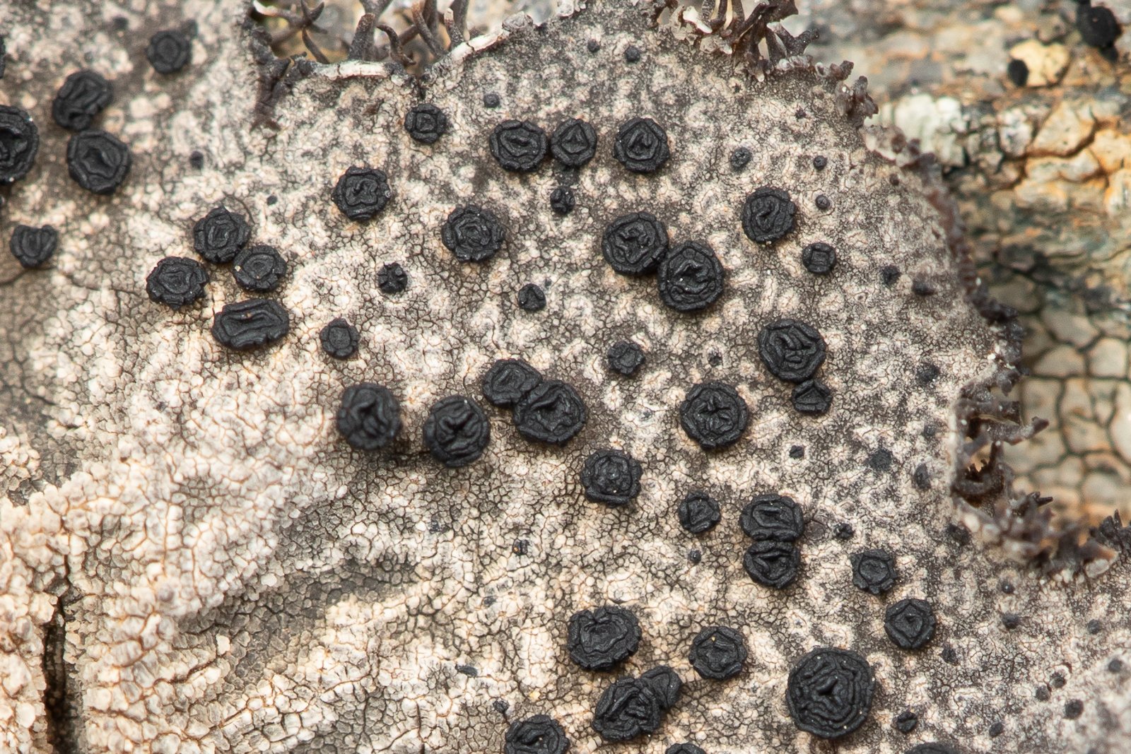 Les cils sur les marges (mais il n'y en a pas partout), les apothécies gyreuses et non enfoncées dans le thalle me font aller plutôt vers Umbilicaria cylindrica ? Belle découverte pour moi, j'étais toute contente lorsque j'ai découvert la forme des apothécies, il est vraiment joli !