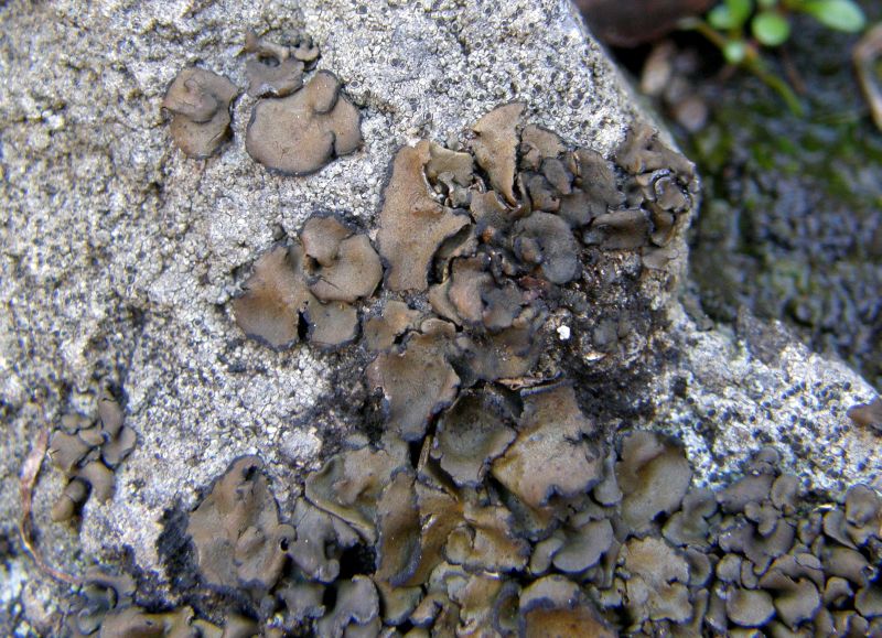 D'abord je mettrai ce lichen dans les l. squamuleux. sans apothécie, avec un thalle non vert, verdissant à l'eau ce qui m'amène vers le genre Ps....