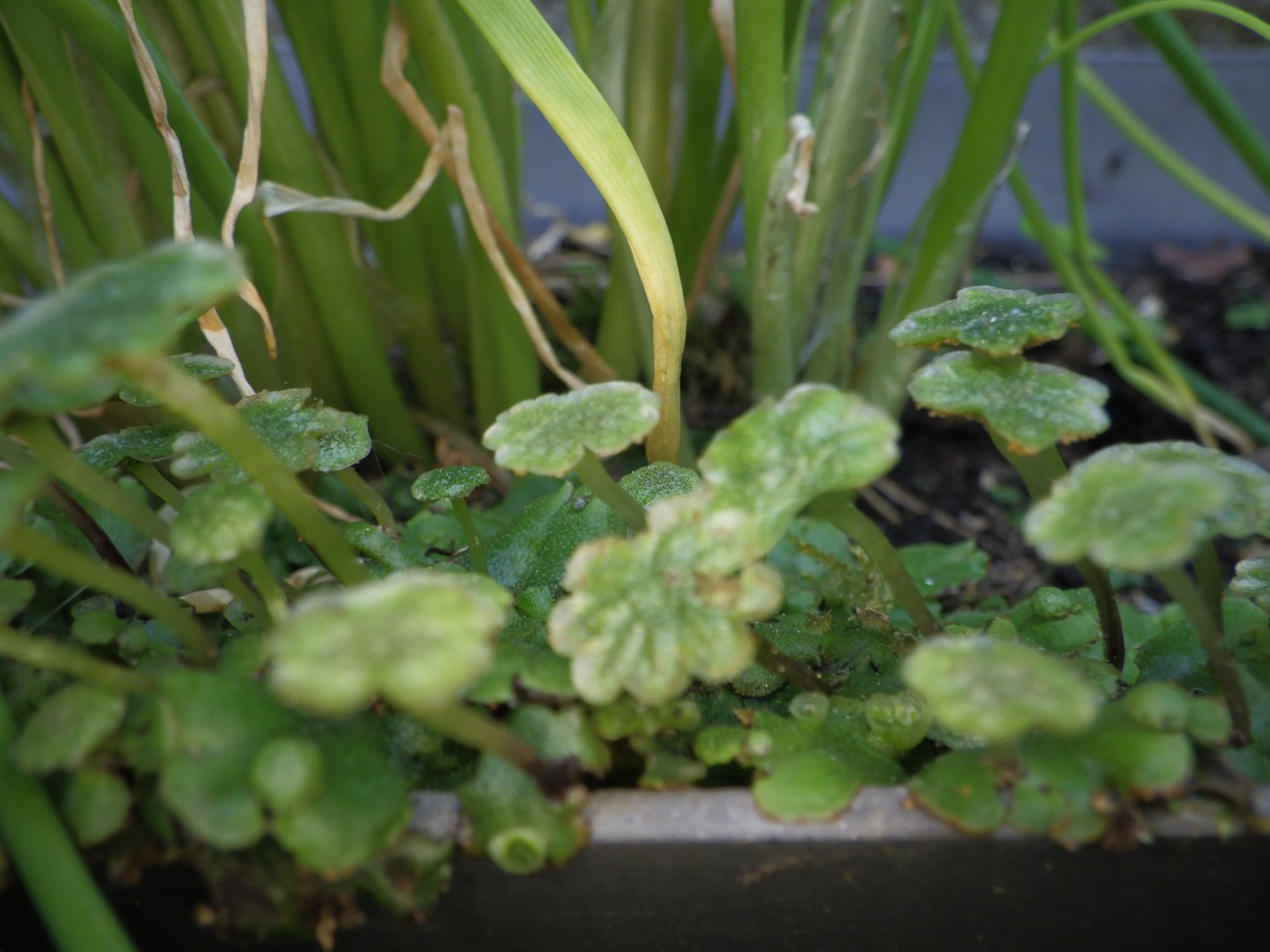 Les petites ombrelles qui surgissent des lames sont des gamétophytes (le cycle de reproduction est un peu compliqué), et les petites cupules en forme d'apothécies sont des organes de reproduction asexuée, comme qui dirait des sortes de pycnides, quoi.