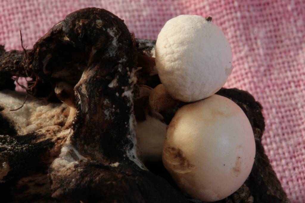 A maturité , le chapeau de l'Astérophore faux lycoperdon est couvert d'une poussière ocre pâle de chlamydospores.