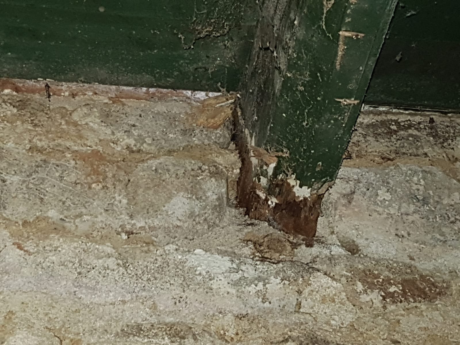 Mycélium développé, entre la pierre et l'enduit, derrière une plinthe (elle meme derriere du polystyrène, de l'agglo etc)