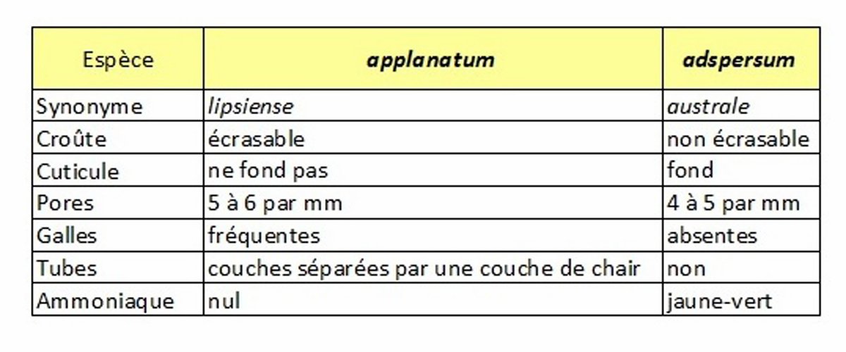 Tu peux aussi contrôler la couleur des spores déposées en masse, notamment sur le chapeau, brun-chocolat pour adspersum, juste brune pour applanatum. Regarder aussi les anciens sujets et en particulier ma première rencontre avec le premier : ici.