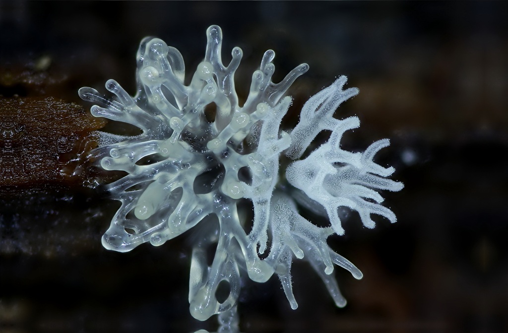Rambouillet le 06/06/19, première rencontre pour moi avec ce myxo spectaculaire vu plusieurs fois sur le forum mais absent jusqu'ici de la galerie (Jean-Pierre, Castor, Dansi et autres vous pourrez ajouter vos - bien meilleures photos - si vous le souhaitez). En fait, les macrophotographies les montrent souvent comme des petits coraux de verre ou de glace, on en oublie qu'ils ne mesurent que quelques millimètres, je voulais montrer à quoi ça ressemble en forêt, hélas ma photo "de loin" est floue. Il faut imaginer une simple bave ou mousse blanc-bleuâtre dans les fentes d'un bout de bois pourri. Et d'un peu plus près, ça donne ça :