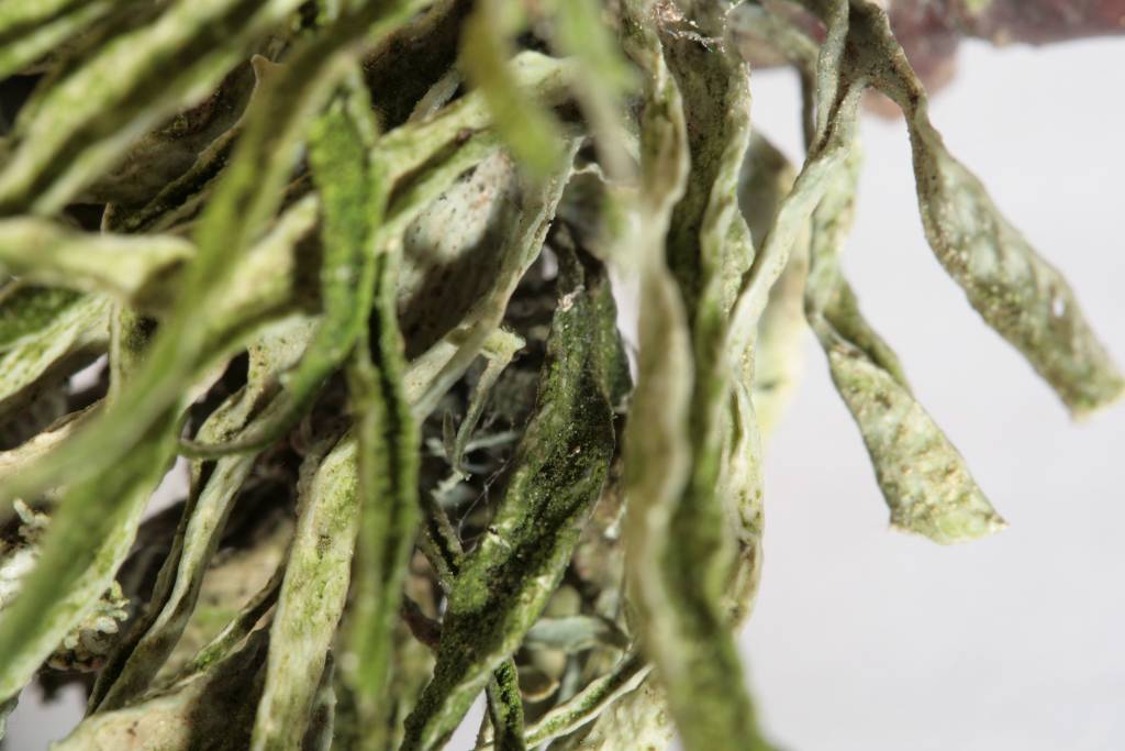 Ce lichen fructuleux, plutôt vert-vert que vert-gris, sur branche de prunellier : 7 cm, la plupart des lanières, en forme de gouttière, sont fines (de 2mm à 5 mm) plutôt en forme de buisson, c-a-dire, montant. K-