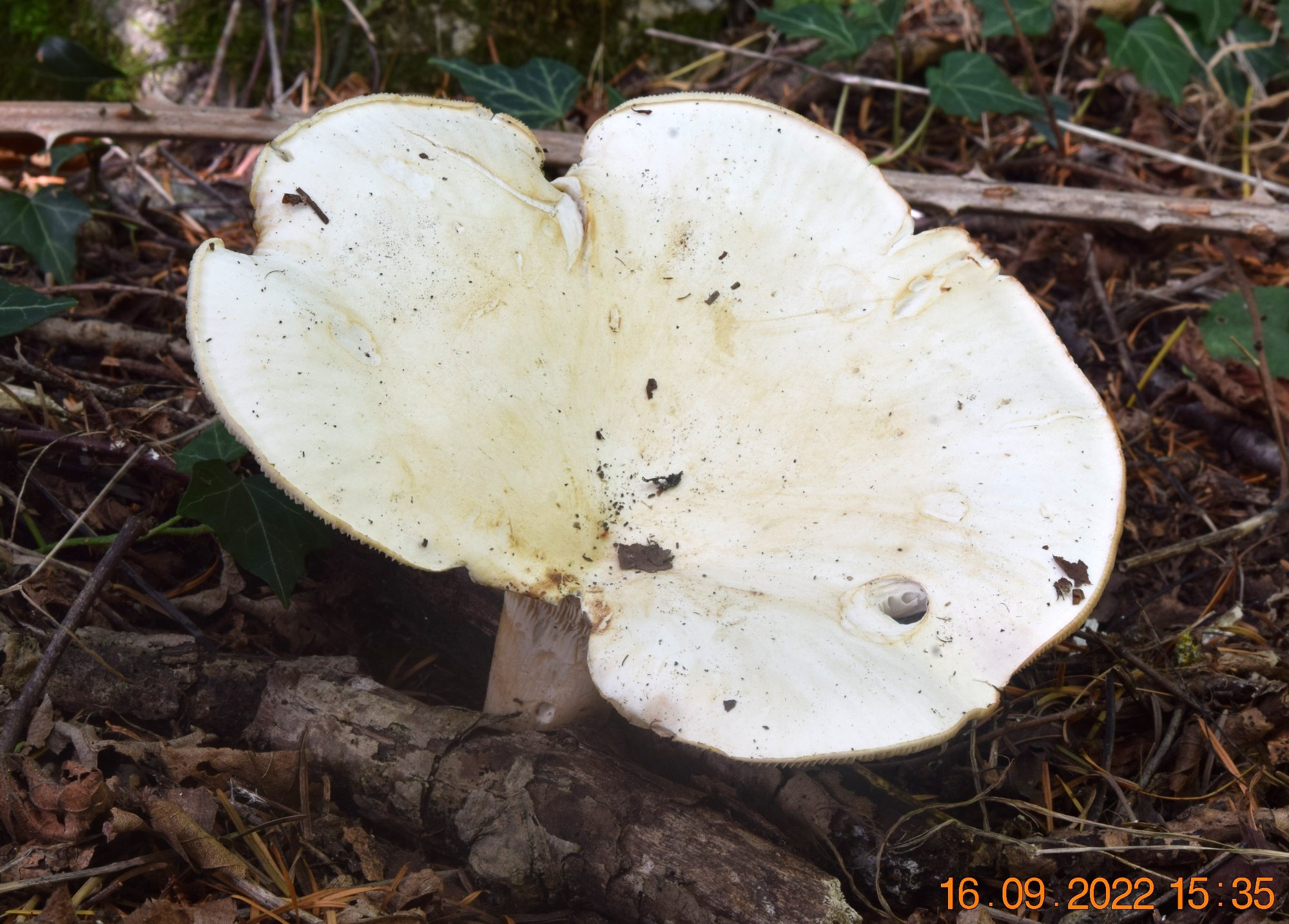 Il faisait partie d'une dizaine d'exemplaires un peu trop avancés. Celui-ci était encore en bon état et le plus grand avec ses 16 cm de diamètre. Odeur faible indéfinissable. Ils poussaient sous Abies en lisière de mon champ et ses spores amyloïdes lisses avaient une largeur comprise entre 3.5 et 4.5 µ. Avec ces caractères, j'ai suivi le GEPR et fait mon choix.