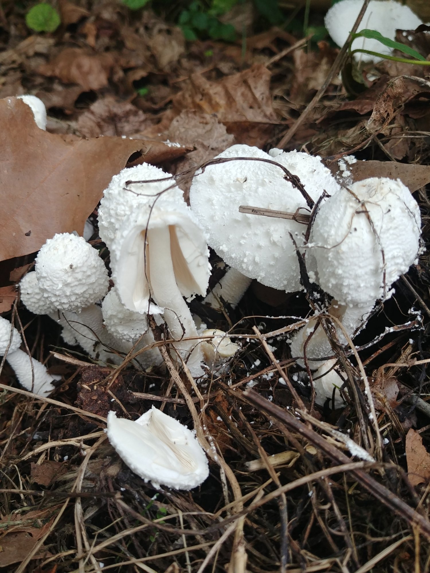 Mon compost est envahi de touffes de champignons blancs. Je pensais à des vesses de loup parce que, jeunes, ils forment des petites boules avec un pied très peu marqué. Mais quand le chapeau s'ouvre je peux voir des lames, blanches aussi. Elles ne sont pas reliées au pied semble t il. Il n'y a ni colerette ni volve. Le dessus du chapeau présente un relief important. Au toucher, ces "écailles" sont un peu floconneuses. À l'odeur je dirais qu'il y a un léger côté lait caillé.