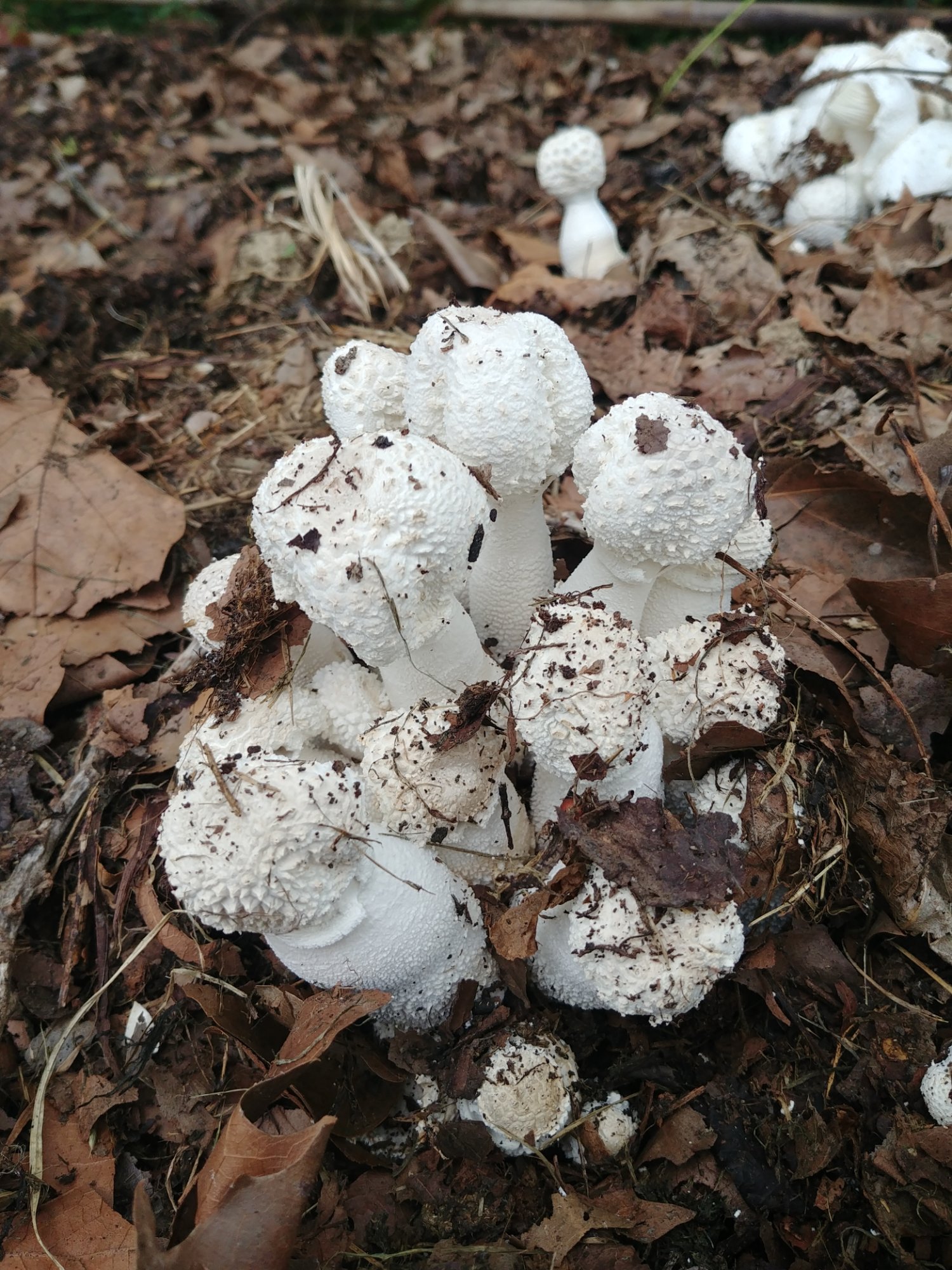 Mon compost est envahi de touffes de champignons blancs. Je pensais à des vesses de loup parce que, jeunes, ils forment des petites boules avec un pied très peu marqué. Mais quand le chapeau s'ouvre je peux voir des lames, blanches aussi. Elles ne sont pas reliées au pied semble t il. Il n'y a ni colerette ni volve. Le dessus du chapeau présente un relief important. Au toucher, ces "écailles" sont un peu floconneuses. À l'odeur je dirais qu'il y a un léger côté lait caillé.