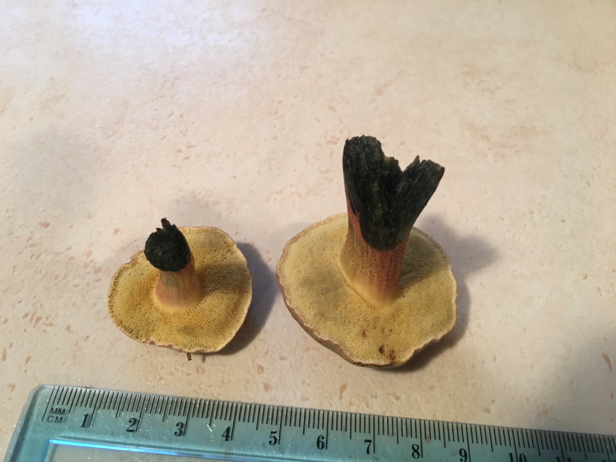Chapeau "velouté" et le pied est devenu bleu (même noir) très foncé là où ils ont été coupé. Le pied est plus (+) rouge aussi ...