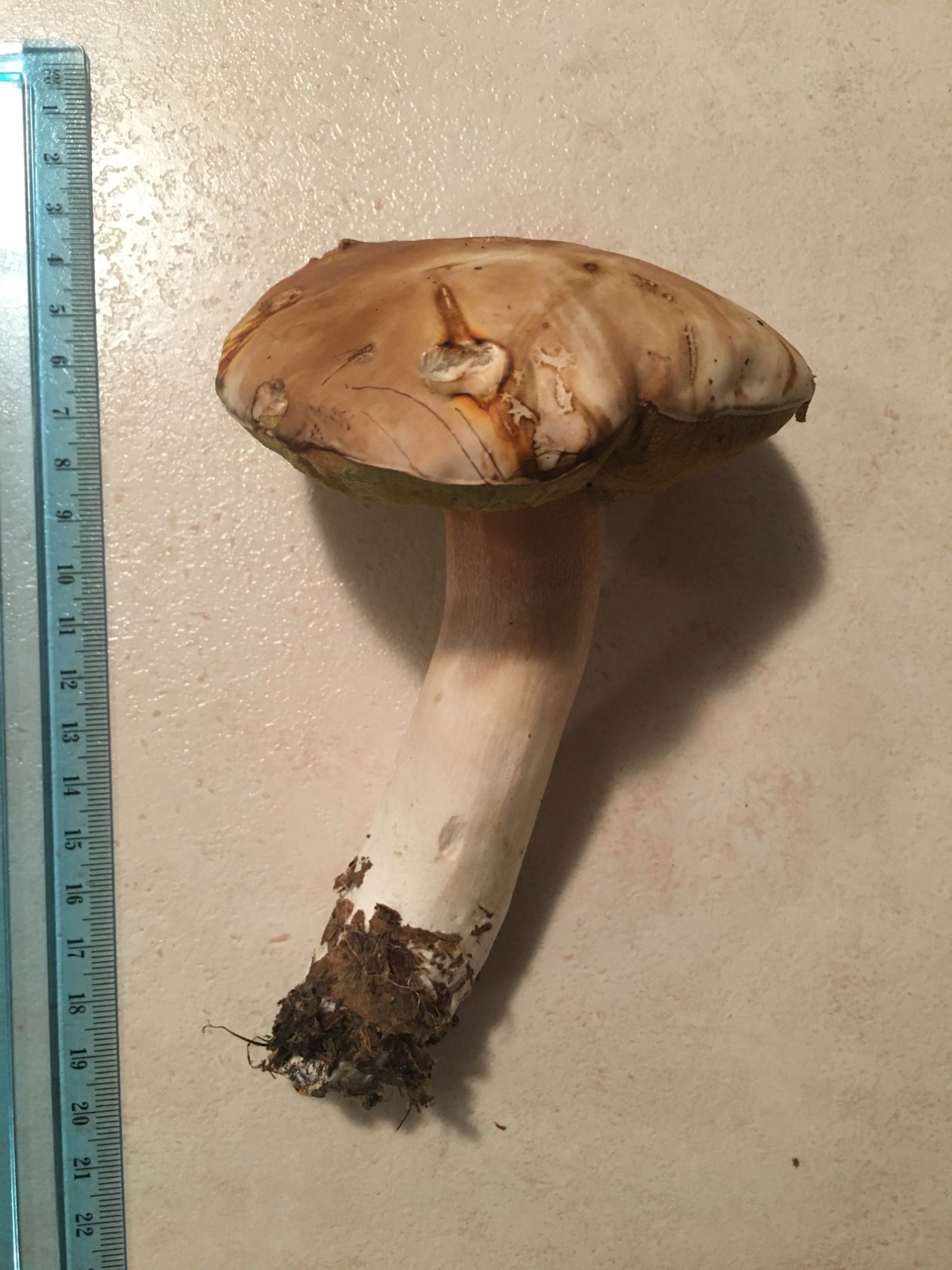 Pour t'aider un peu, si j'arrive à bien identifier l'espèce malgré la lumière artificielle, les pores devaient être blancs au départ puis sont devenus jaune verdâtre. Si tu réalises une coupe de haut en bas, souvent indispensable pour les bolets, tu pourras observer qu'elle est blanche et le reste : elle ne bleuit pas. Il est possible qu'un peu de rose soit présent dans la chair sous la cuticule (la mince "peau" qui recouvre le chapeau).