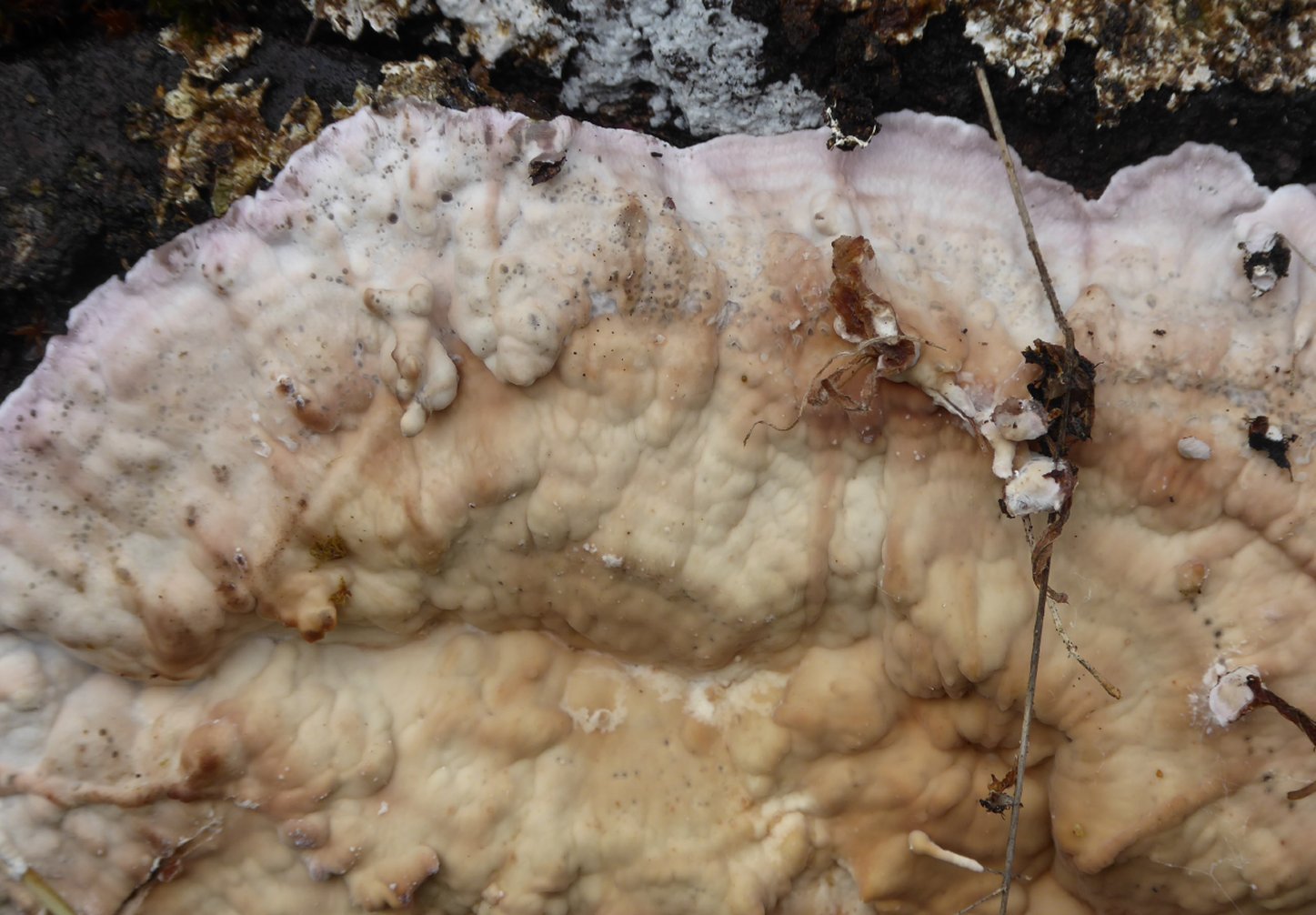 Très présente, cette espèce peu former de belle surface résupinée, puis des étages de consoles à hymenium non poré visiblement (lisse apparemment), bordé de rose.
