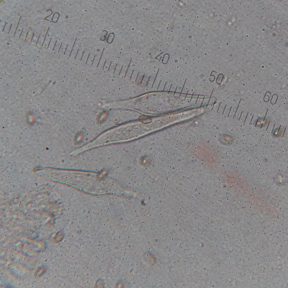 Dans les autres images, les petites gradations représentent 3.75 µm. En haut le pied était clairement pruineux et j'y ai trouvé les caulocystides suivants.