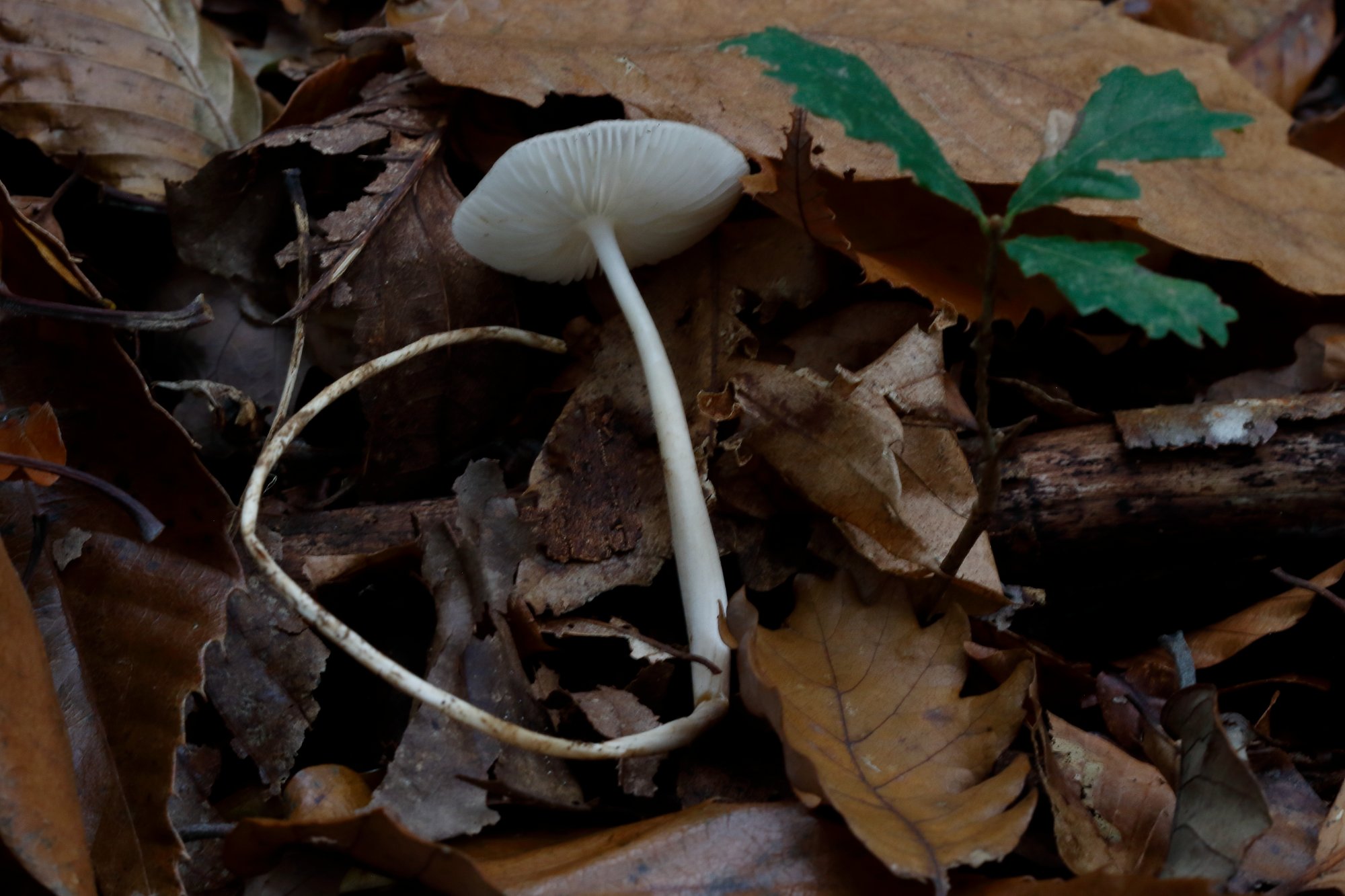 Très caractéristique par son chapeau ridé et visqueux, cette Collybie présente cette longue racine prolongeant le pied qui marque nom d'espèce: Hymenopellis radicata anciennement Oudemansiella radicata. Rencontrée dans les hêtraies, elle serait directement en contact avec les racines ou du bois enterrés. Je renomme.