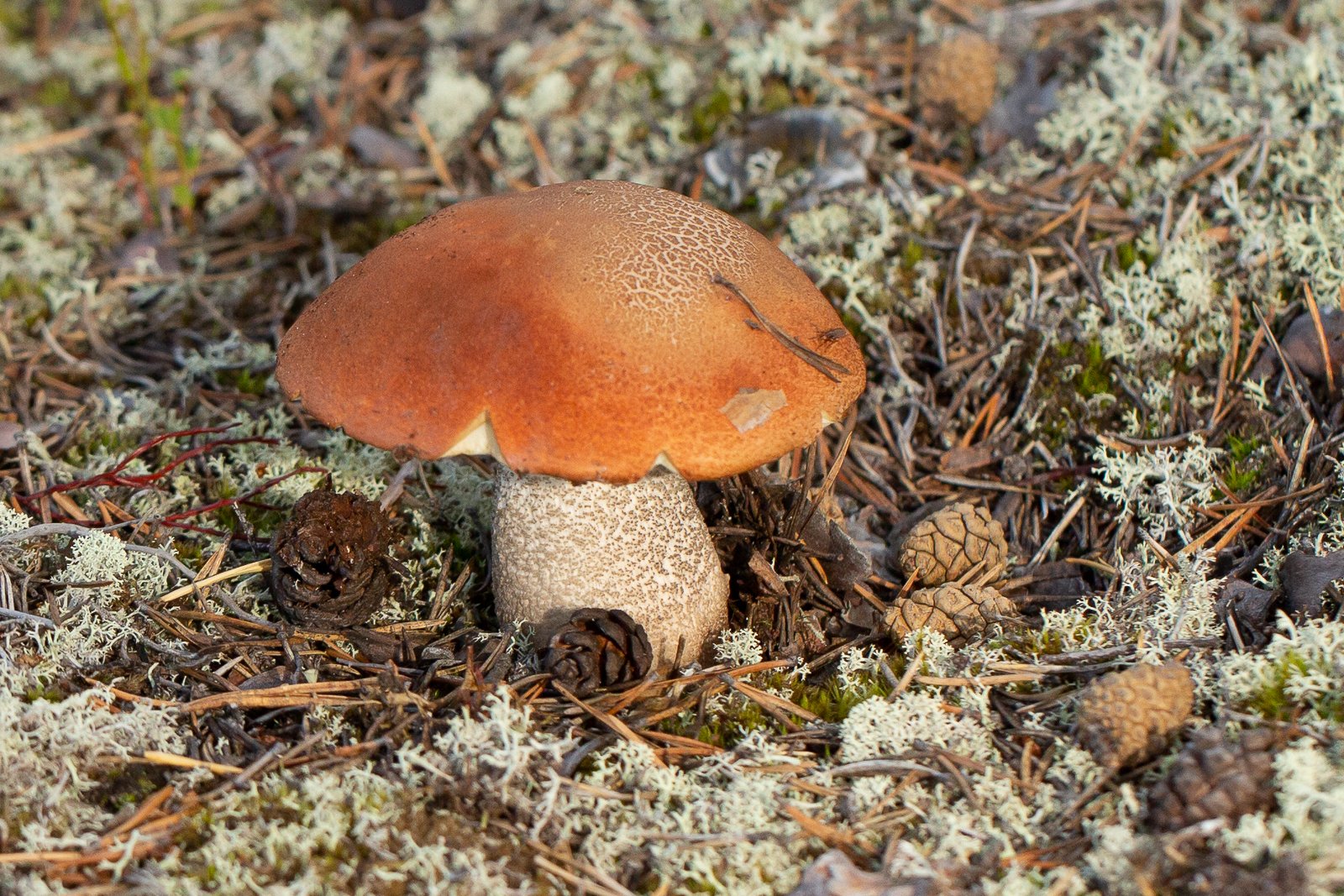 J'ai tenté la clé de MycoDB en choisissant comme critères "chapeau orange" et "pousse sous conifères". Il me propose 17 espèces de plusieurs genres, celui qui me semble le mieux coller est Leccinum. Mais dans mon livre il est dit que le pied est long ce qui n'est pas le cas du mien. Cependant sur certaines photos de Leccinum in situ, le pied est court aussi.