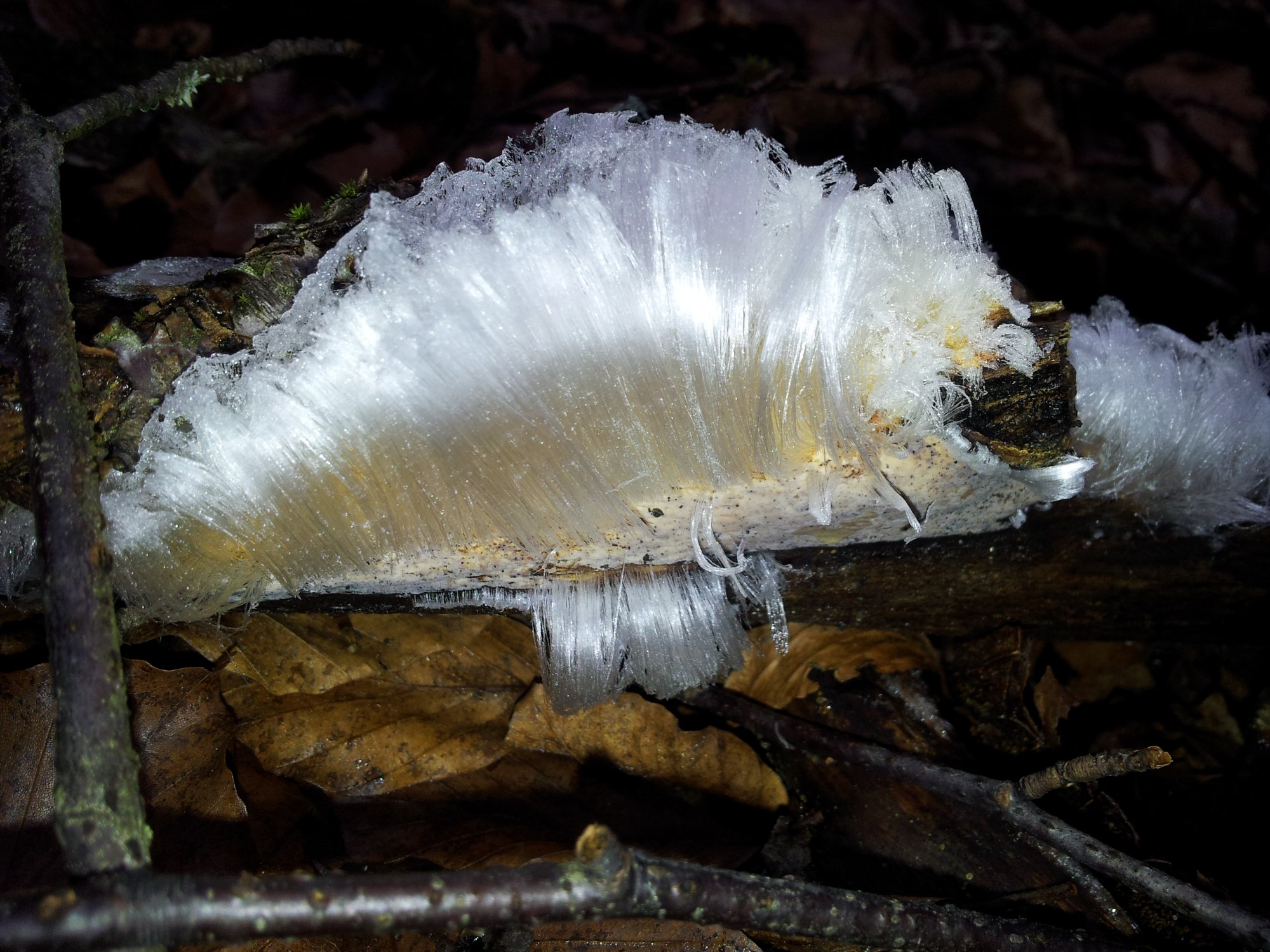 Bonjour, ce sont des «cheveux de glace». Phénomène dû au champignon Exidiopsis effusa, décrit ici.