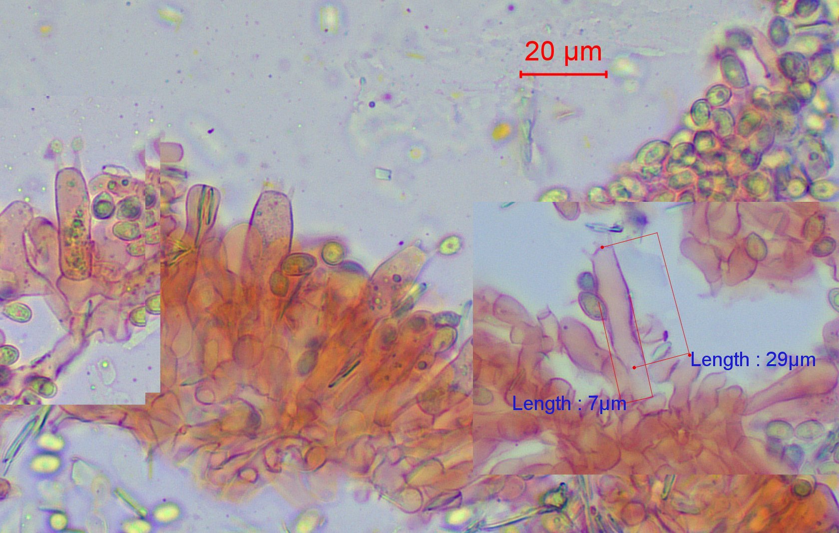 Personalmente sto cercando di individuare la stabilità di altri caratteri. Uno è lo spessore dei cistidi imeniali all'apice e la forma e distribuzione dei caulocistidi lungo il gambo.