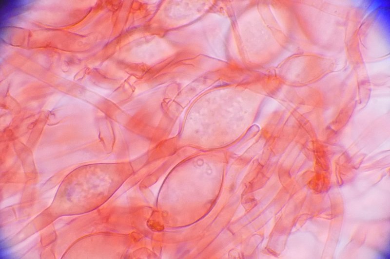 Au microscope, les spores sont petites et hyalines. On observe aussi des cellules filiformes entre les basides.