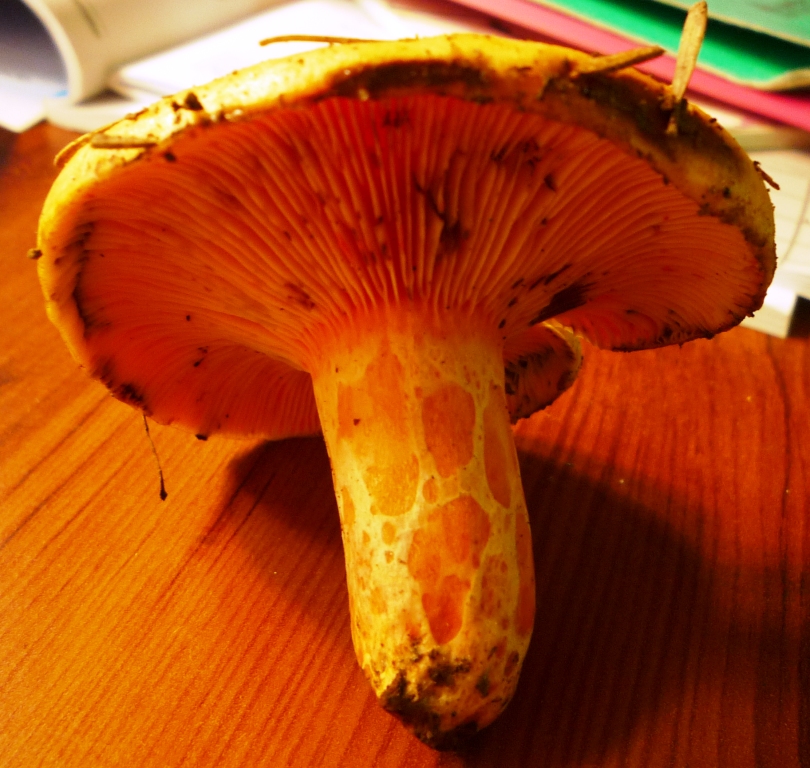 Lorsque l'on regarde la base du pied on voit nettement le rougissement du lait tardif..ce qui ne va pas avec L. deliciosus ajouter à cela l'habitât et les scrobicules je ne voit rien d'autre qu'un vulgaire L. salmonicolor.