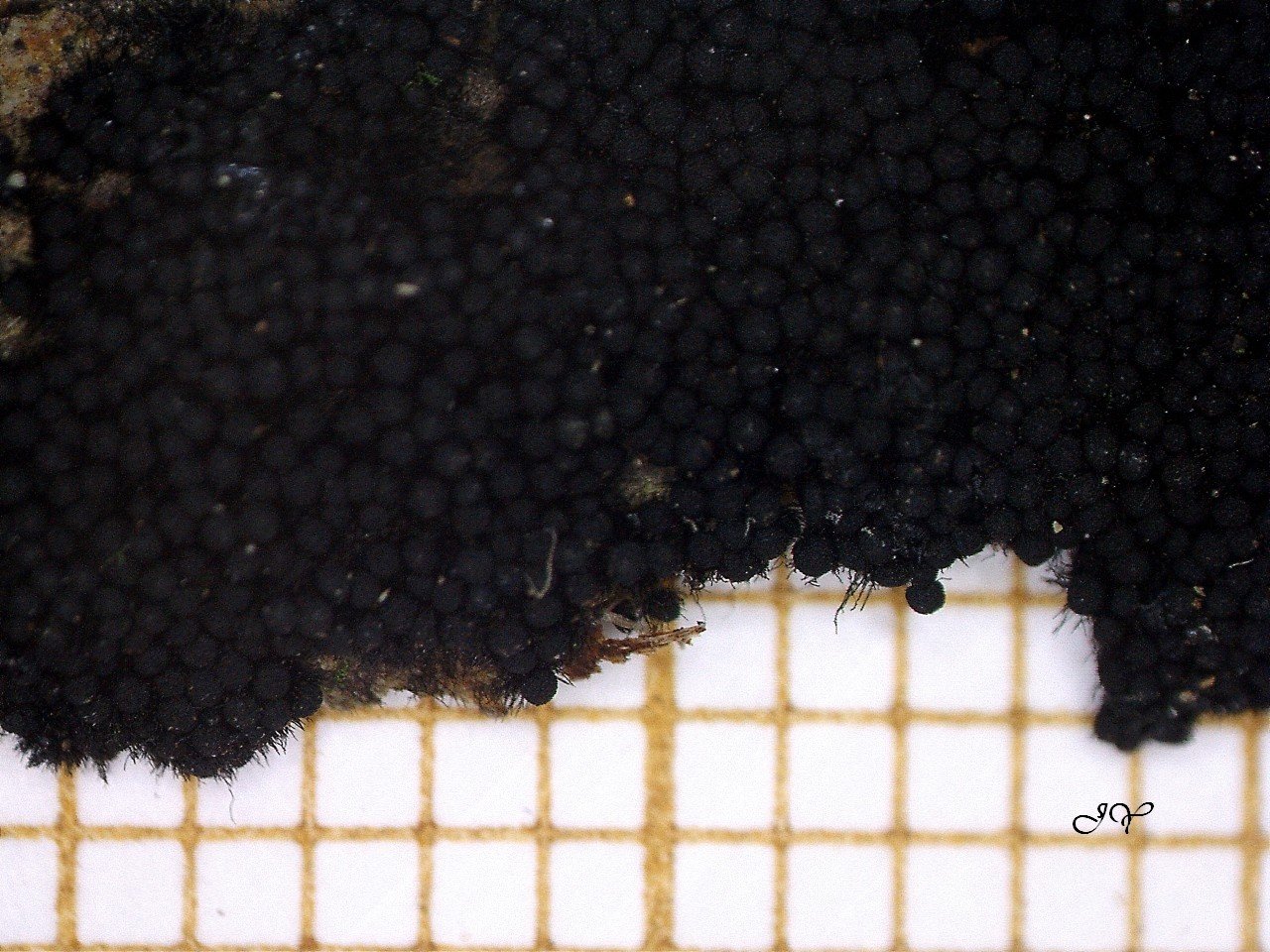 Sur une petite branche morte au sol, en zone humide, je découvre ces minuscules "billes" noires qui me rappellent Ruzenia spermoides,