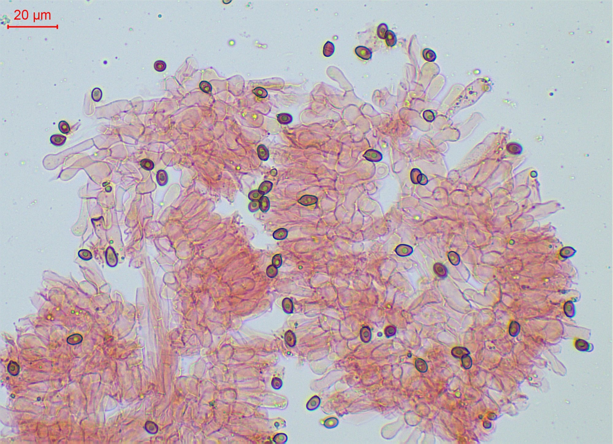 Sur le champignon à peu près sec, je ne retrouve plus l'odeur perçue sur le stipe sur le terrain (scléroderme?). L'odeur de la chair reste faible mais évoque plutôt une odeur fongique et très faiblement d'amande.