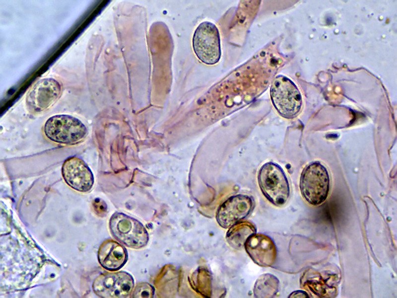 Je viens de retrouver une de mes micros avec des spores variables (non sur sporée) comparables aux tiennes. Les cystides sont identiques !