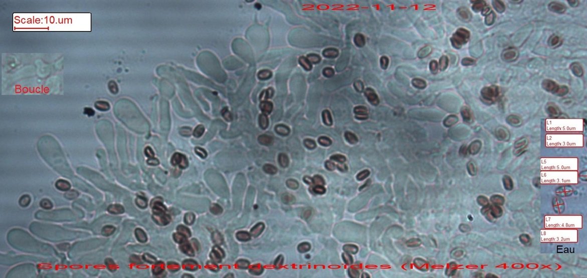 Spores 5 x 3µ fortement dextrinoîdes = Leucogyrophana mollusca (Fries) Pouzar.