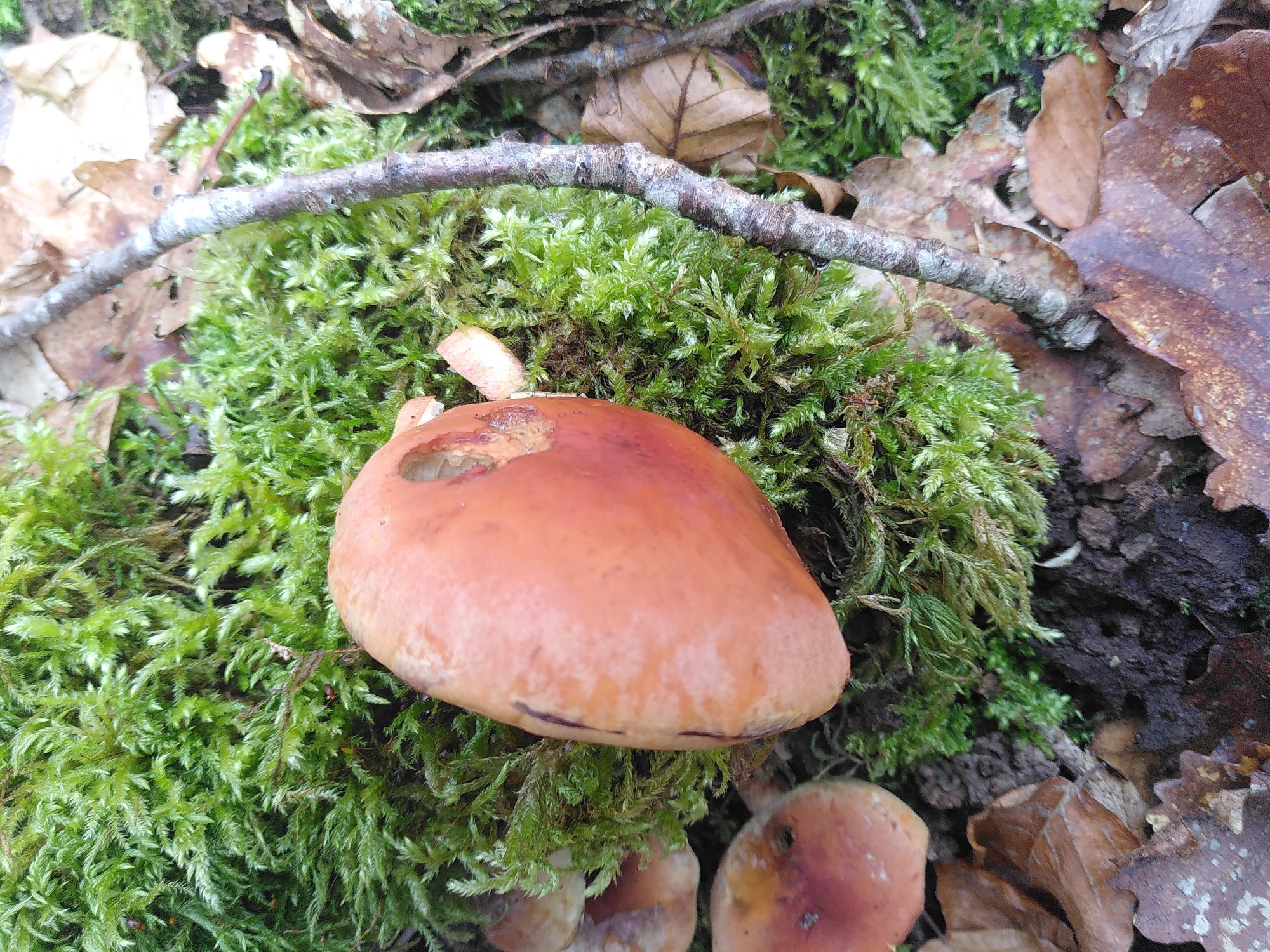 Chapeau : Convexe, 3-8 cm (pour les exemplaires prélevés). Beige-orangé à brun-roux, plus foncé au centre. Lisse avec une périphérie légèrement méchulée (pas sûr que ce terme existe, je manque encore de vocabulaire...!).